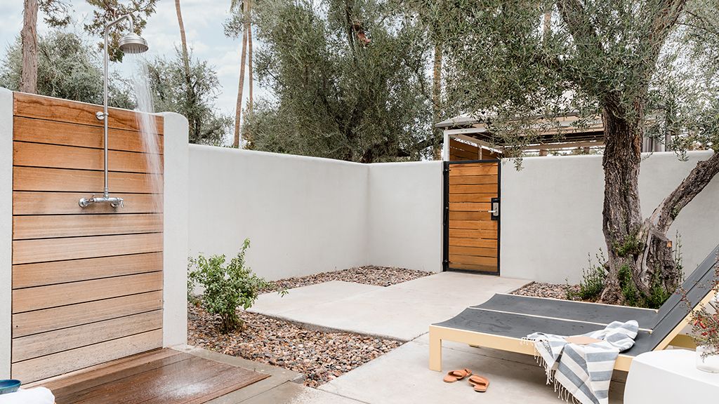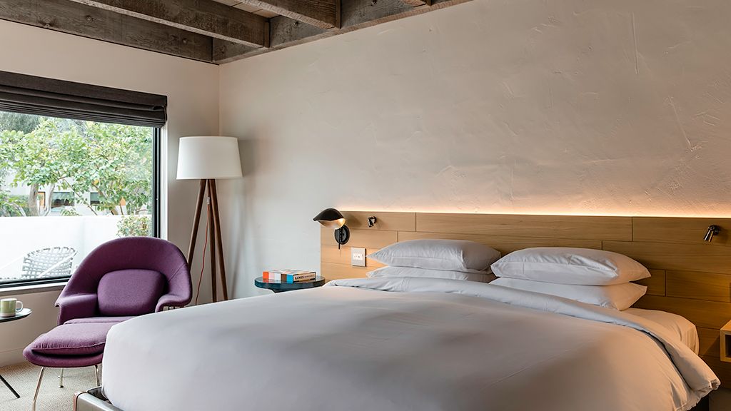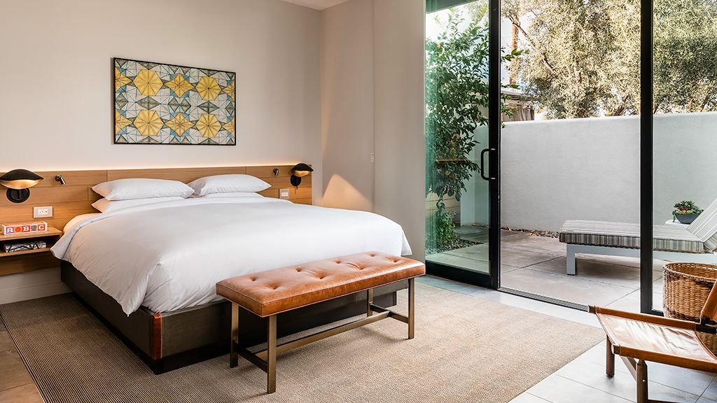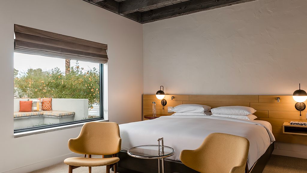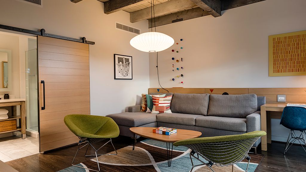 Relax in this modern bungalow featuring a plush king bed and an oversized bathroom. This bungalow also offers a private patio with lounge furnishings to sit back and enjoy the desert scenery and is named for design icons Charles and Ray Eames.