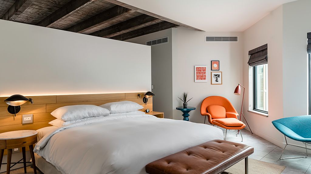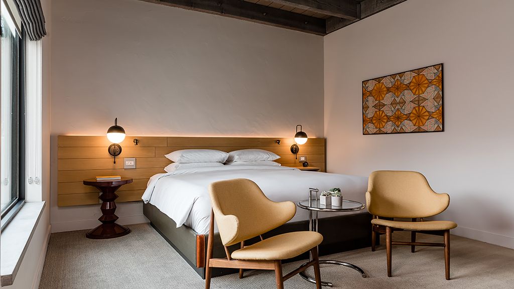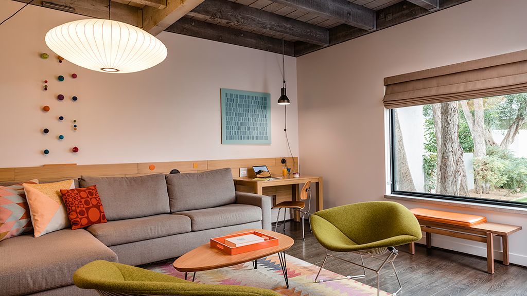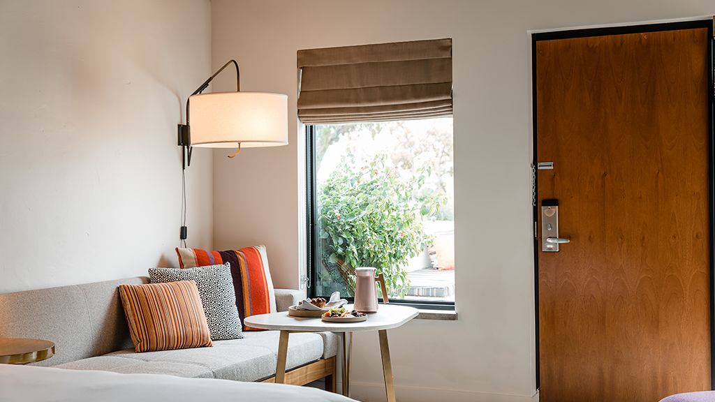 Our Saarinen Studio Suites offer separate work and lounge spaces, a large dual-head shower, and private furnished patio—along with a unique womb chair made famous by the room’s namesake, architect and designer Eero Saarinen.