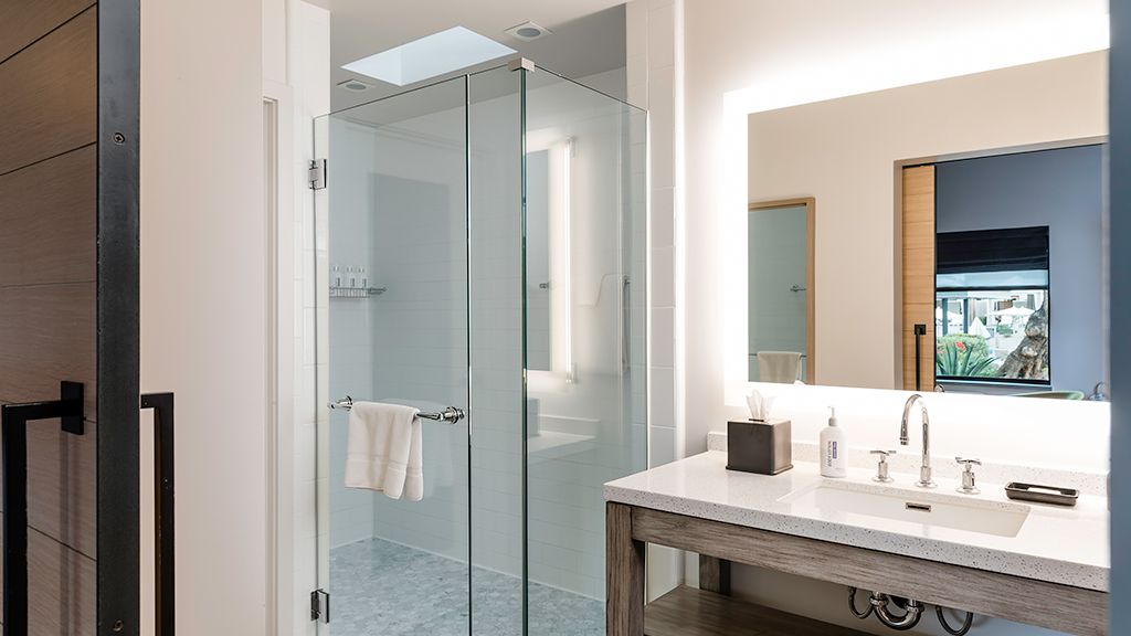 One of our largest accessible bungalows, this space offers separate work and lounge areas, a dual-head shower, and private furnished patio—along with a unique womb chair made famous by the room’s namesake, architect and designer Eero Saarinen. Includes: Terrace with outdoor seating, Private back patio with chaise lounges, Naturally lit bathroom, 40 square feet of shower space with dual shower heads, 65” Wi-Fi enabled TV, Keurig machine, Emergency fire alarm system including strobe-light smoke detectors, Lower-level closet shelves, entryway features, and bathroom features, Wide bathroom doorways, Grab bars, Raised toilet seats