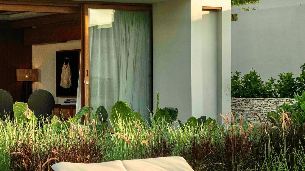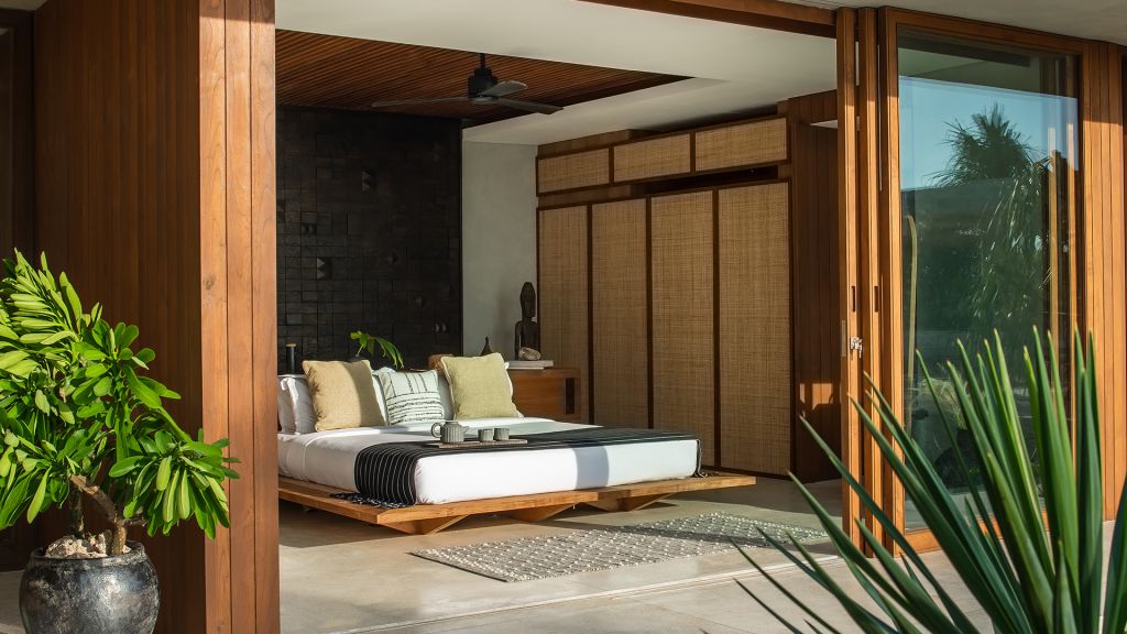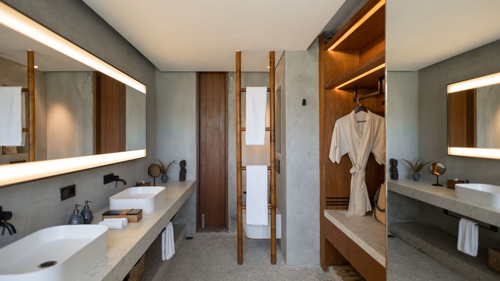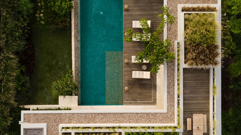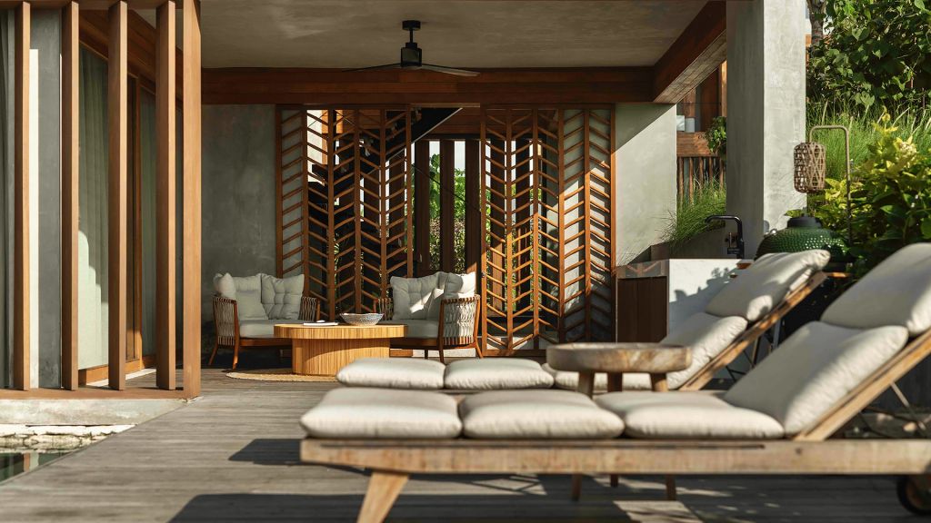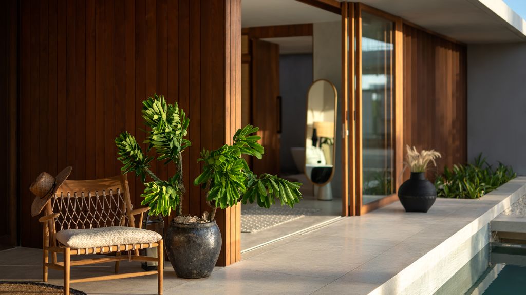 270sqm (2,910sqft) - Three bedrooms with three ensuite bathrooms - 2 super king and 2 single beds - Walk-in shower and freestanding bathtub - Double vanity - Ocean view from every room - L-shaped infinity pool (13x4x7m) - Vast private garden - Semi-outdoor pool lounge area - Dining table for 6 - Indoor living room - Fully equipped kitchen - Kamado grill - Smeg espresso machine - Klipsch Heritage Groove speakers - Complimentary mini-bar refilled daily - Complimentary Wi-Fi. The 3-bedroom villas are just set back from the beach in the 2nd row. The master bedroom offers sweeping ocean views from the comfort of bed at daybreak, drinks at sunset in the private lounge area against a backdrop of the sea, and a bath under the stars in the semi-open ensuite bathroom come night. Two more bedrooms, each with ocean view, complete the luxurious accommodation of the 3-bedroom villas. Each villa also boasts a spacious lounge area with a fully-equipped kitchen. With an expansive private garden, complete with a large L-shaped swimming pool and BBQ area, the villas are perfect for families and groups of friends, offering them the luxury of time together while also providing a multitude of secluded spaces for moments of privacy.