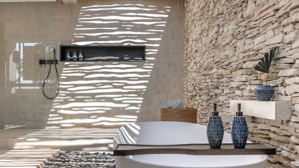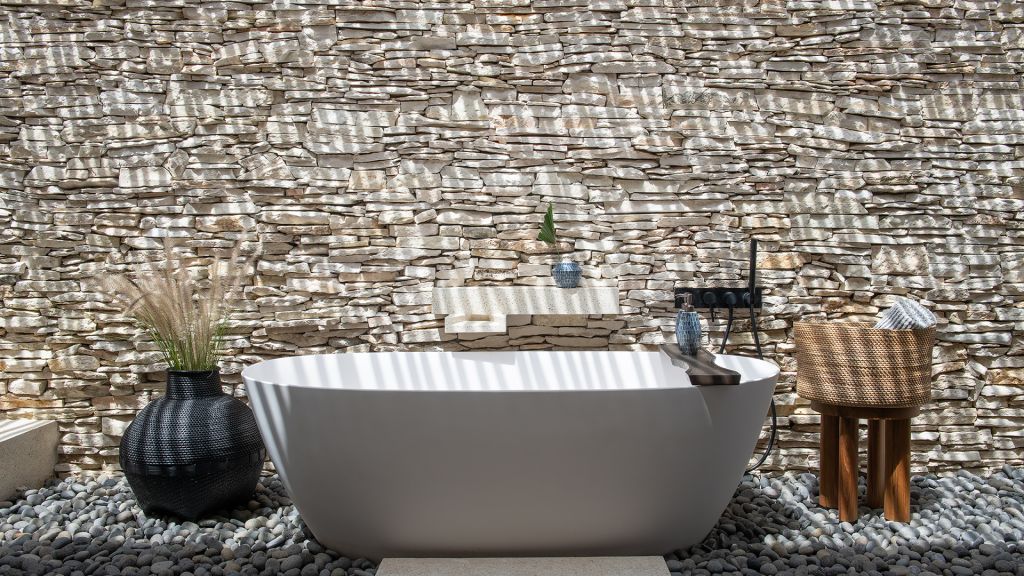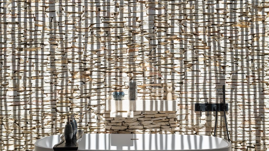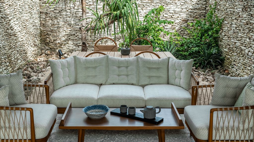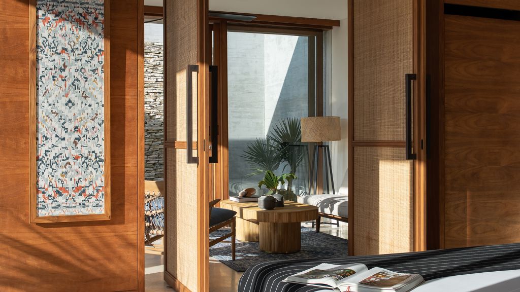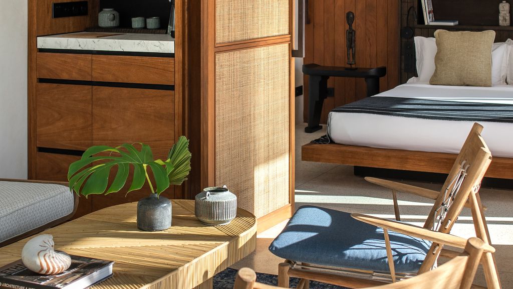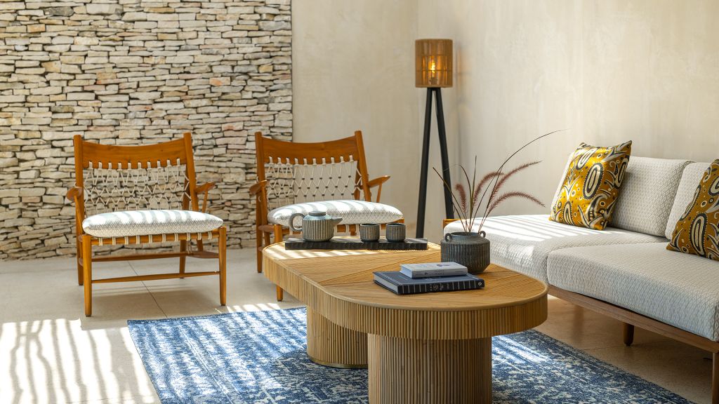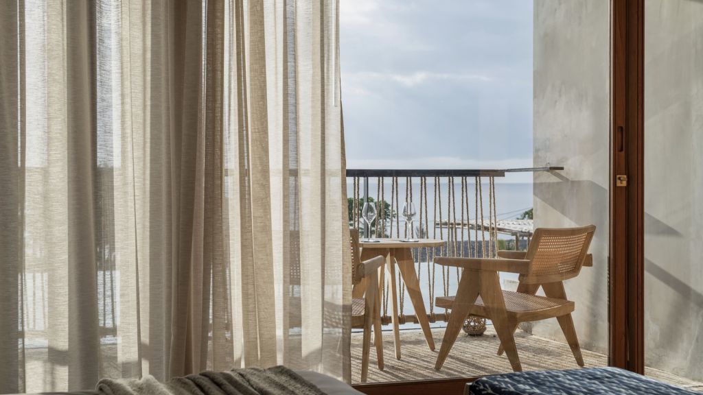 130 sqm (1,396sqft) Two bedrooms with two ensuite bathrooms - Super-king beds - Walk-in shower - Double vanity - Garden and ocean view - Private outdoor lounge area with daybed for each bedroom - Indoor sitting area with sofa in each bedroom - Complimentary mini-bar refilled daily - Complimentary Wi-Fi. The spacious shared terrace connects two generous bedrooms adorned with local artifacts, artwork, and bespoke ceramics. This beautiful area includes a semi-outdoor sitting space with a comfortable sofa, armchairs, and a dining table nestled within a dry-stone wall patio. Each bedroom boasts a private terrace with a daybed, while the minimalistic bathrooms feature organic materials and a double vanity for added luxury.