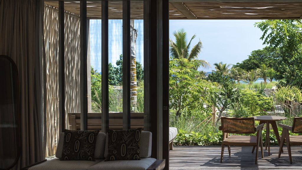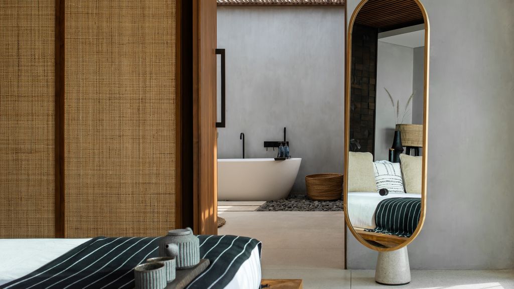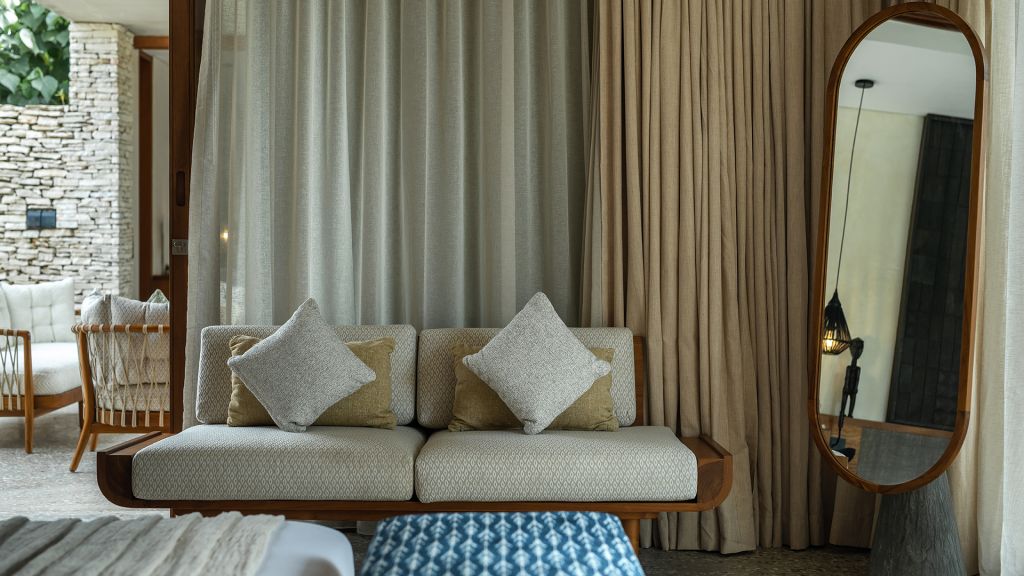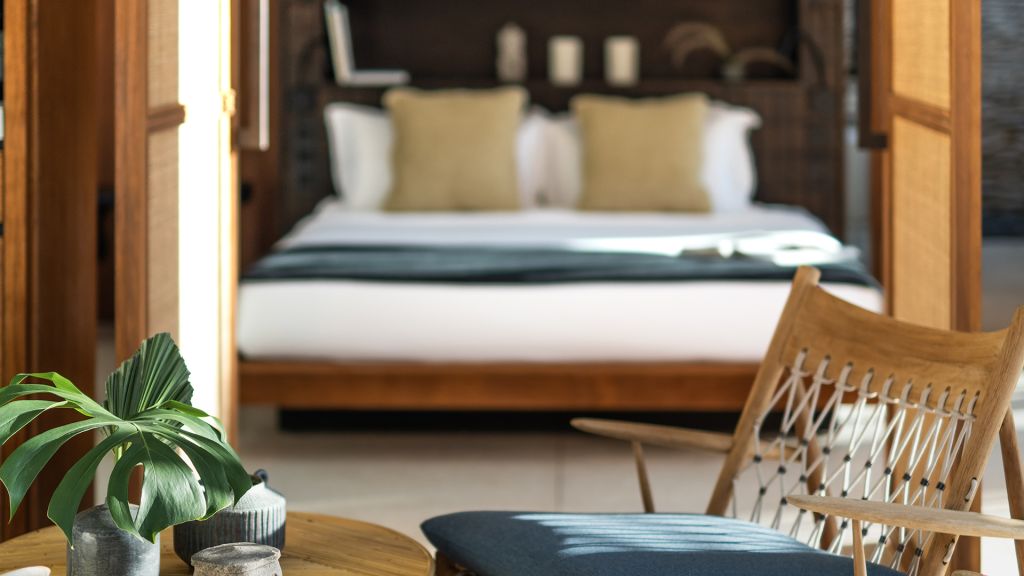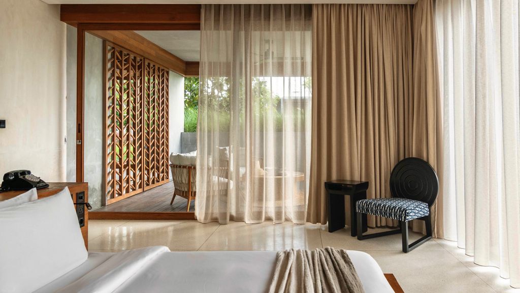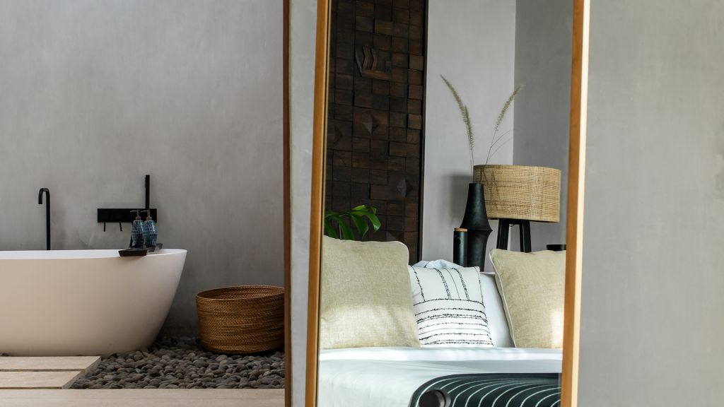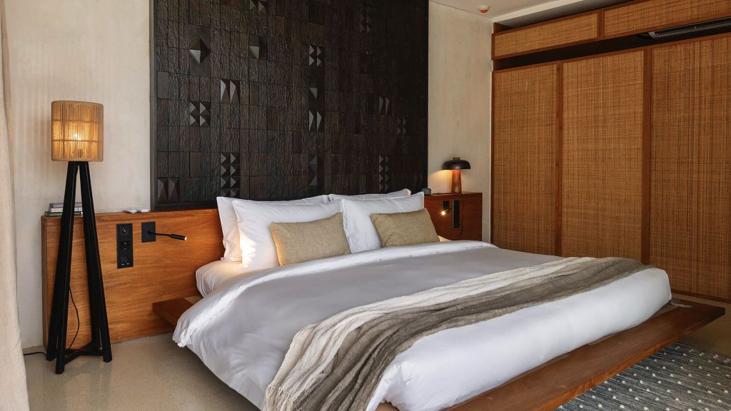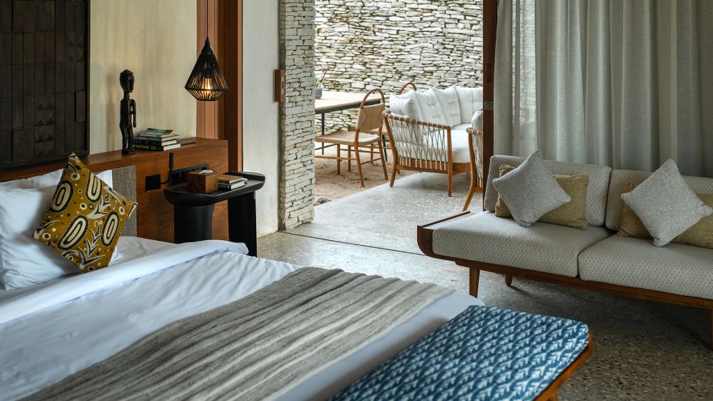 42sqm (452sqft) - Super king bed - Walk-in shower - Double vanity - Ocean view - Balcony - Klipsch Heritage Groove speakers - Complimentary mini-bar refilled daily - Complimentary Wi-Fi. Located on the upper floor of the main building, the Studio rooms offer sweeping views of the Indian ocean, beach and gardens. Highlights here include a hand carved wood panel inspired by Sumba Ikat, bespoke ceramics, commissioned artwork by Alexander Sebastianus, textiles by Pierre Frey. The generously sized minimalistic bathroom features organic materials and a double vanity.