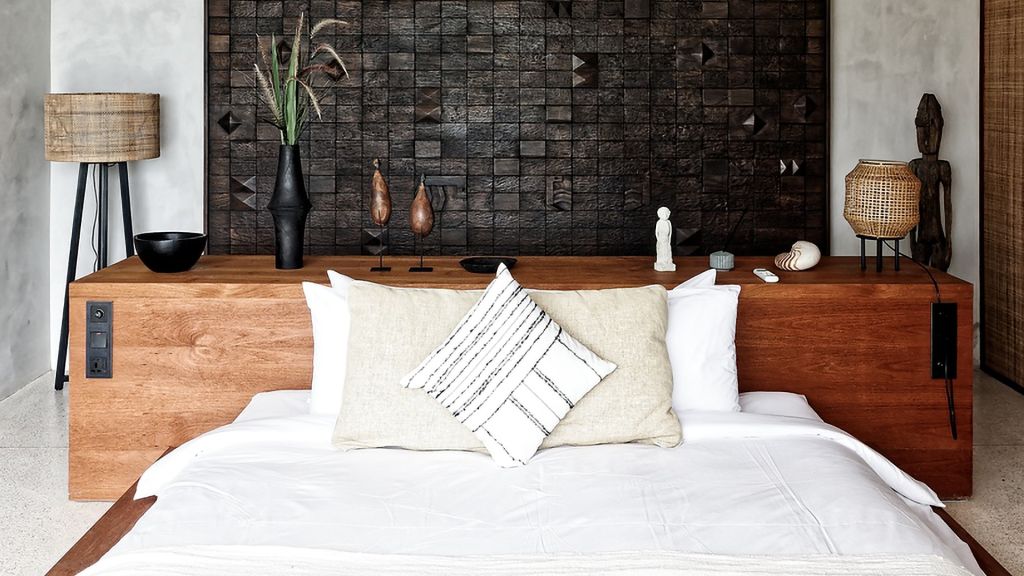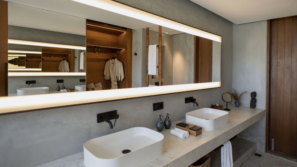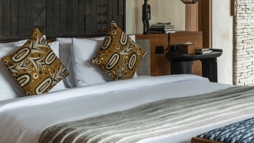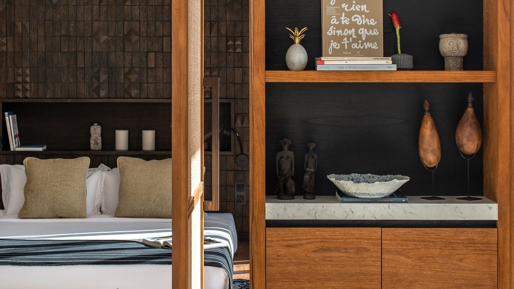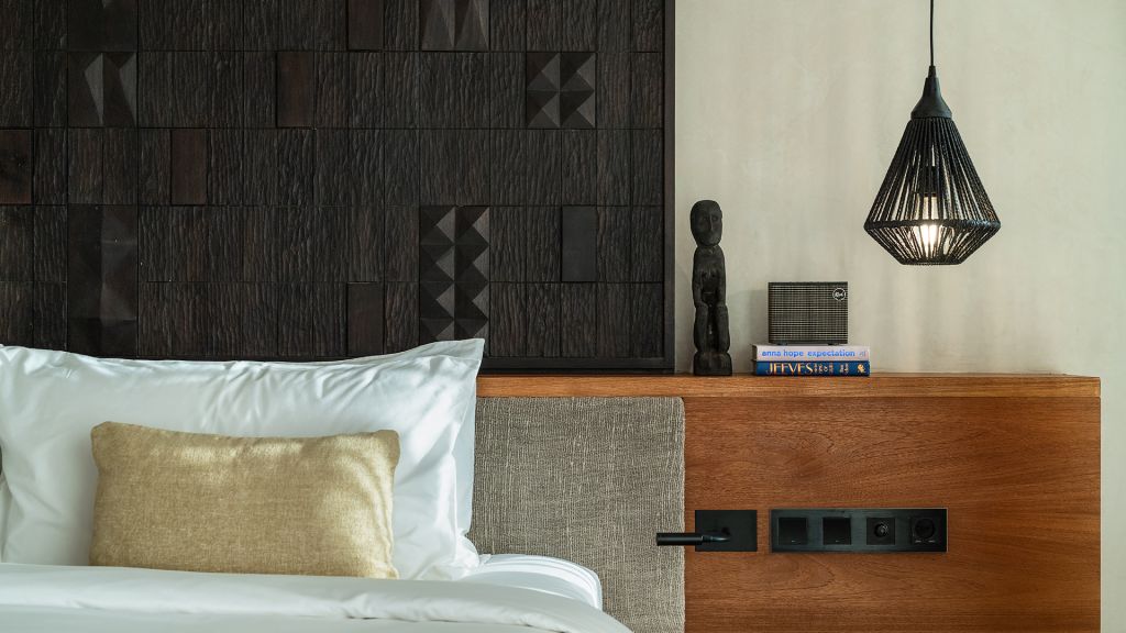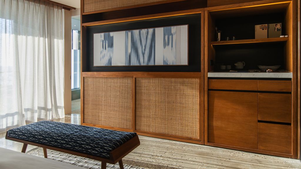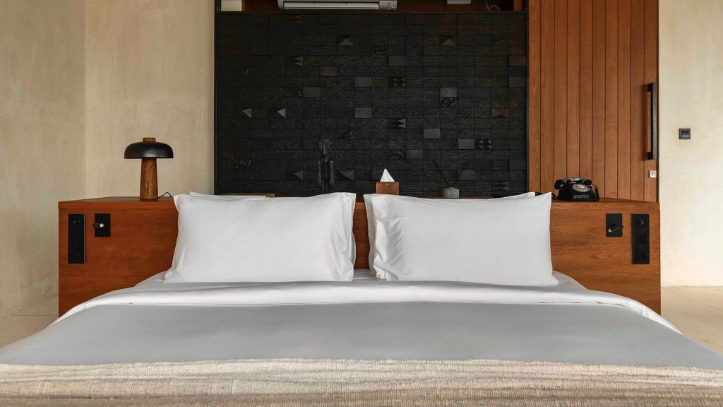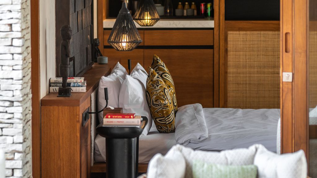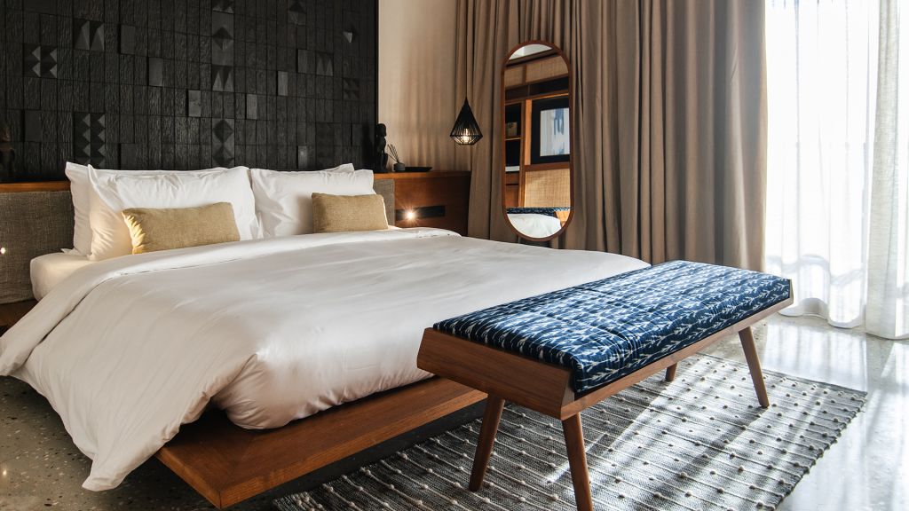 42sqm (452sqft) - Super king bed - Walk-in shower - Double vanity - Ocean view - Balcony - Klipsch Heritage Groove speakers - Complimentary mini-bar refilled daily - Complimentary Wi-Fi. Located on the upper floor of the main building, the Studio rooms offer sweeping views of the Indian ocean, beach and gardens. Highlights here include a hand carved wood panel inspired by Sumba Ikat, bespoke ceramics, commissioned artwork by Alexander Sebastianus, textiles by Pierre Frey. The generously sized minimalistic bathroom features organic materials and a double vanity.