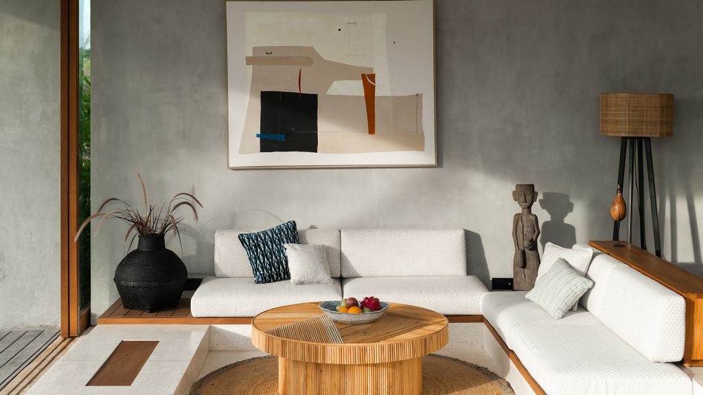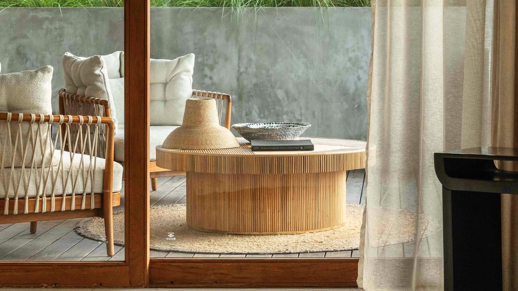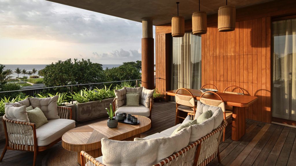 52sqm (560sqft) - Super king bed - Walk-in shower - Double vanity - Ocean and garden view - Outdoor lounge area with daybed - Sitting area - Klipsch Heritage Groove speakers - Complimentary mini-bar refilled daily - Complimentary Wi-Fi. Nestled within charming low-rise units surrounded by lush greenery and close by the beach, Terrace Studios offer a peaceful retreat. The spacious terrace with a large daybed and dining table leads into a room that’s decked in local artifacts, artwork and bespoke ceramics. The generously sized minimalistic bathroom features organic materials and a double vanity.