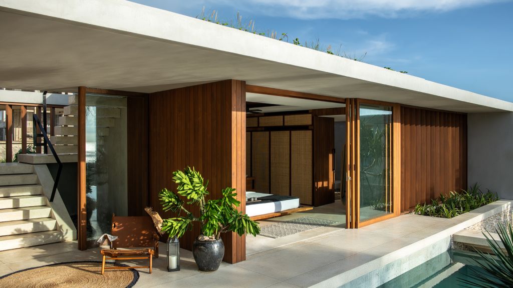 180sqm (1,937sqft) One bedroom with ensuite bathrooms - Super king and/or 2 single beds - Large walk-in shower and alfresco bathtub - Double vanity - Ocean view - Private infinity pool (12x5m) - Deck with sunbeds - Private garden - Spacious indoor living space that can be fully opened - Lounging area - Dining table for four - Rooftop with dining table - Fully equipped kitchen - Kamado grill - Smeg espresso machine - Klipsch Heritage Groove speakers - Complimentary mini-bar refilled daily - Complimentary Wi-Fi. The One-bedroom villas are located in the 2nd and 3rd rows, each surrounded by its own lush private garden. The elegant dining room and pool lounge, adorned with Sumbanese artifacts, artwork by Yuki Nakayama and a curated selection of books, create a magnificent space for relaxation and intimate dining. The space can be fully opened or air-conditioned to suit your comfort. The generous pool and deck with sunbeds invite relaxation. The bedroom features a super king-size bed, allowing you to awaken to the breathtaking view of the pool seemingly melting into the ocean. The spacious bathroom, adorned with Sumba stone, includes a stunning bathtub for unforgettable moments under the open sky.