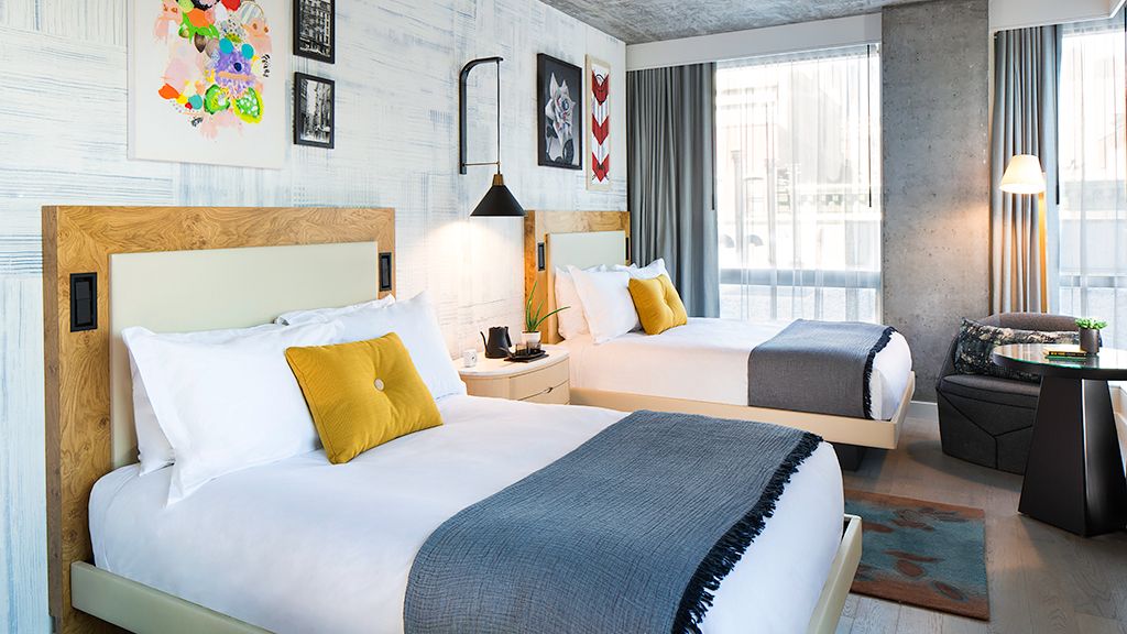 Relax within this 295-square-foot room, boasting two double beds, a rainfall showerhead and bathtub, and floor-to-ceiling windows with Lower Manhattan, Little Italy and Lower East Side views.