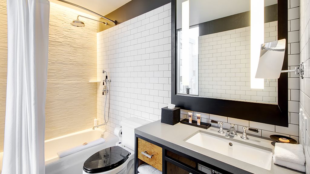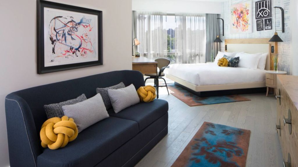 This 260-square-foot room comes with one king bed, a roll-in shower, and floor-to-ceiling windows with views of Lower Manhattan, SoHo and the Lower East Side. Includes: Emergency strobe light and strobe-light smoke detector, Cordless phone, Wide doors, Lowered thermostat and light switches, Lowered peephole and door latch, ADA Accessible bathroom