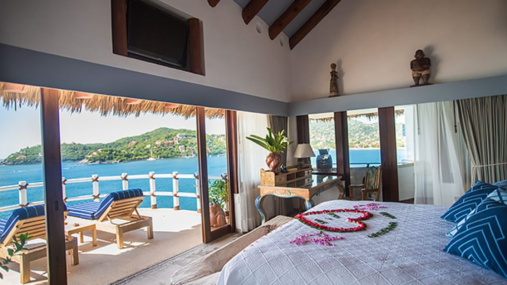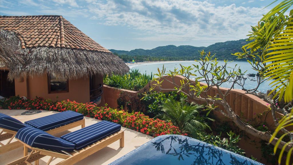 Oceanfront penthouse suite features 1 King bed, 180 degree view, ocean view, Mexican decor and plunge pool.