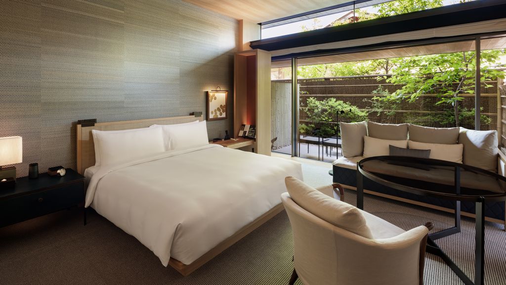 Celebrating the hotel's unique surroundings, a selection of preferred views include both the old and the new garden, as well as traditional local architecture and design. The interior of this spacious 45-square-meter guest room is subtle and inviting, following a design concept inspired by the mountains. Fragrant tamo wood and local materials anchor time-old tradition in a modern space. Offering one king bed, a working area and a day bed that provides space for greater relaxation, residential comfort and the warm feeling of home in the hills of Higashiyama. Rooms in this category are suitable for up to two adults. A baby crib is available upon request. * Same category rooms may have different views and layouts.