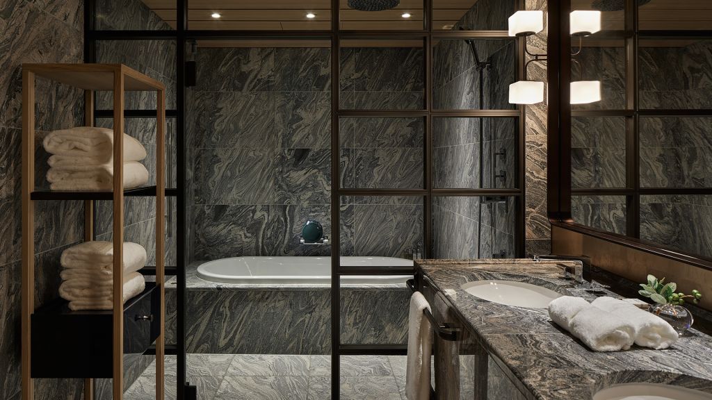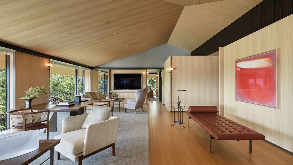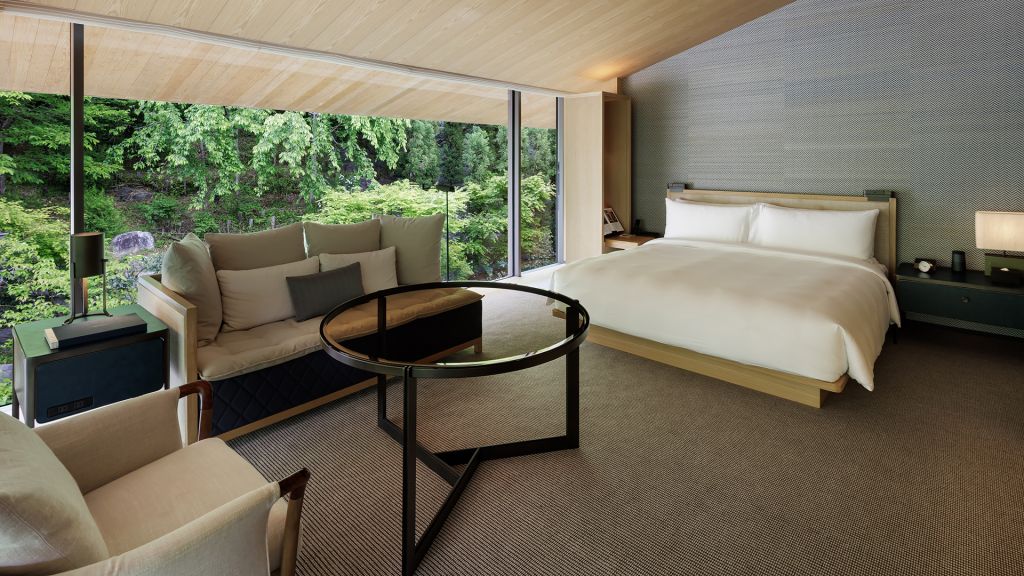 A luxurious hillside retreat of 68 square meters, the interior of this spacious guest room is subtle and inviting, following a design concept inspired by the mountains. Fragrant tamo wood and local materials anchor time-old tradition in a modern space. Offering one king bed, a working area and a day bed that provides space for greater relaxation, residential comfort and the warm feeling of home in the hills of Higashiyama. * Same category rooms may have different views and layouts.