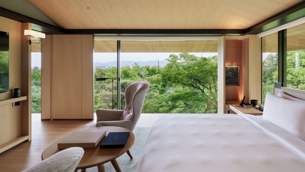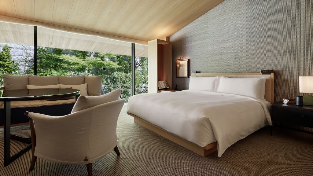 In harmony with the stillness and privacy of the hotel's surroundings, the interior of this spacious 45-square-meter guest room with hillside views is subtle and inviting, following a design concept inspired by the mountains. Fragrant tamo wood and local materials anchor time-old tradition in a modern space. Offering one king bed, a working area and a day bed that provides space for greater relaxation, residential comfort and the warm feeling of home in the hills of Higashiyama. Rooms in this category are suitable for up to two adults. A baby crib is available upon request. * Same category rooms may have different views and layouts.