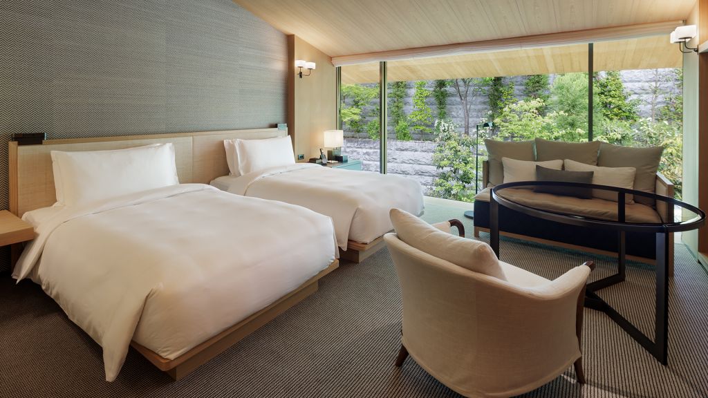 In harmony with the stillness and privacy of the hotel's surroundings, the interior of this spacious 45-square-meter guest room with hillside views is subtle and inviting, following a design concept inspired by the mountains. Fragrant tamo wood and local materials anchor time-old tradition in a modern space. Offering two twin beds, a working area and a day bed which provides space for greater relaxation, residential comfort and the warm feeling of home in the hills of Higashiyama. Rooms in this category are suitable for up to two adults. A baby crib is available upon request.