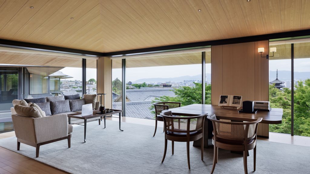 Enjoy exquisite views of famed Yasaka Pagoda, Kyoto's urban expanse and the dramatic sunset with a luxurious hillside retreat of 68 square meters. The interior of this spacious guest room is subtle and inviting, following a design concept inspired by the mountains. Fragrant tamo wood and local materials anchor time-old tradition in a modern space. Offering one king bed, a working area and a day bed that provides space for greater relaxation, residential comfort and the warm feeling of home in the hills of Higashiyama.* Same category rooms may have different views and layouts.