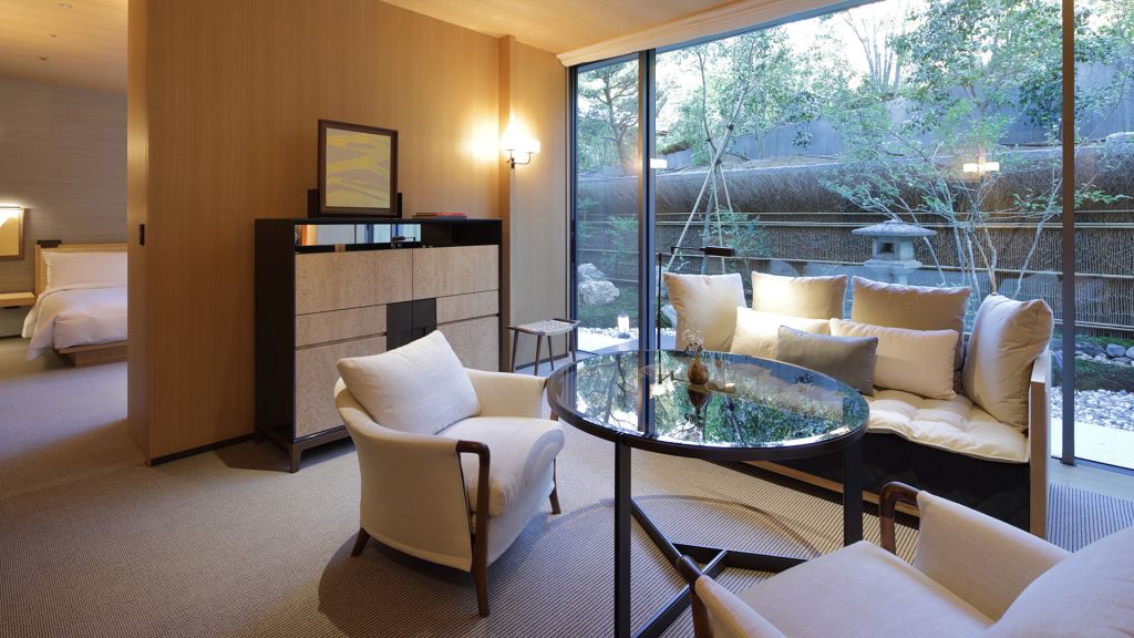 An exclusive tsuboniwa, or private Japanese garden, gives a layer of serenity and calm. The interior of this spacious 45-square-meter guest room is subtle and inviting, following a design concept inspired by the mountains. Fragrant tamo wood and local materials anchor time-old tradition in a modern space. Offering two twin beds, a working area and a day bed that provides space for greater relaxation, residential comfort and the warm feeling of home in the hills of Higashiyama. Rooms in this category are suitable for up to two adults. A baby crib is available upon request. * Same category rooms may have different views and layouts.