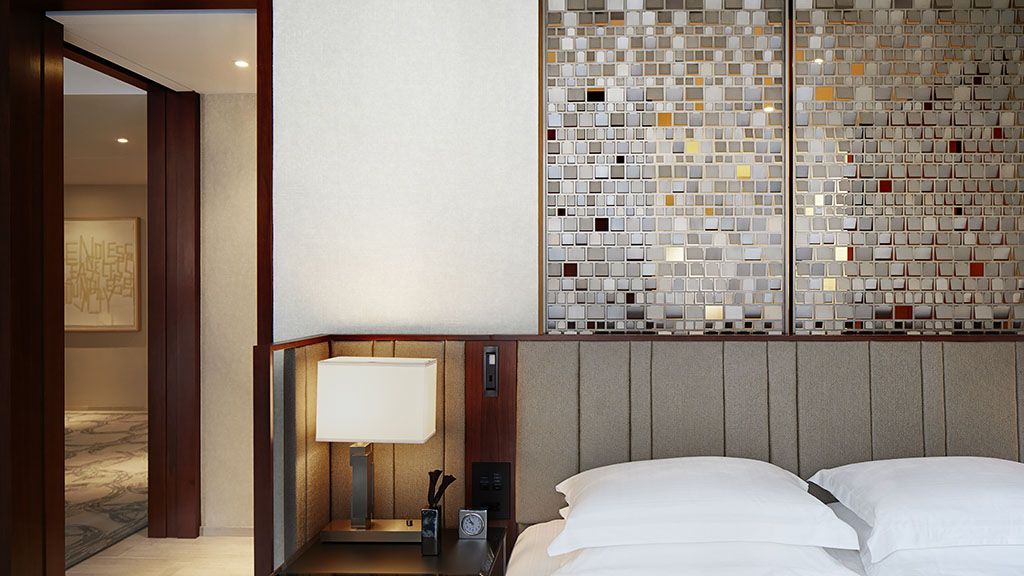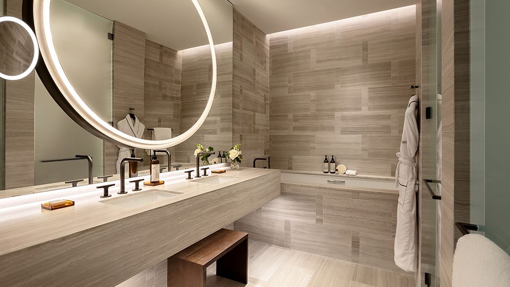 This 1,000-square-foot corner suite offers striking views, a living area, natural stone flooring and luxurious amenities.