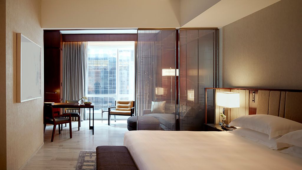 This junior suite offers 825 square feet and includes a spa-like bathroom with a rainfall shower and marble bath, plus city views.