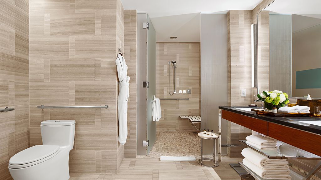 This fully accessible suite offers 1,000 square feet of space, a roll-in shower, bathtub, and a private terrace boasting city views