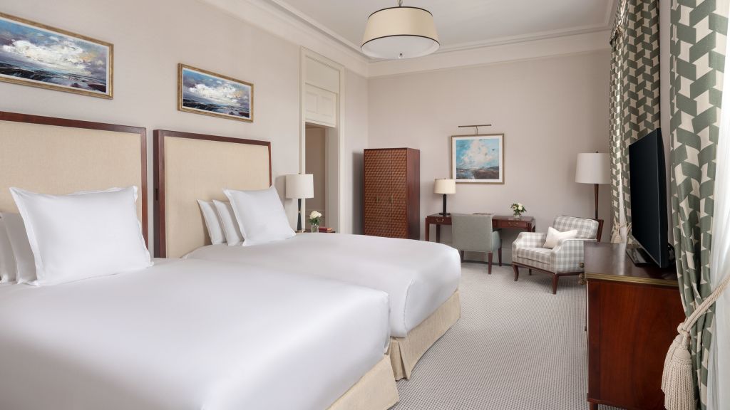 Executive Room with two twin beds and views of the grand internal courtyard and iconic Edwardian architecture of The OWO. Marble bathroom, luxurious cottons, slippers and bathrobes, WiFi, coffee and tea, minibar.