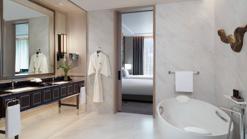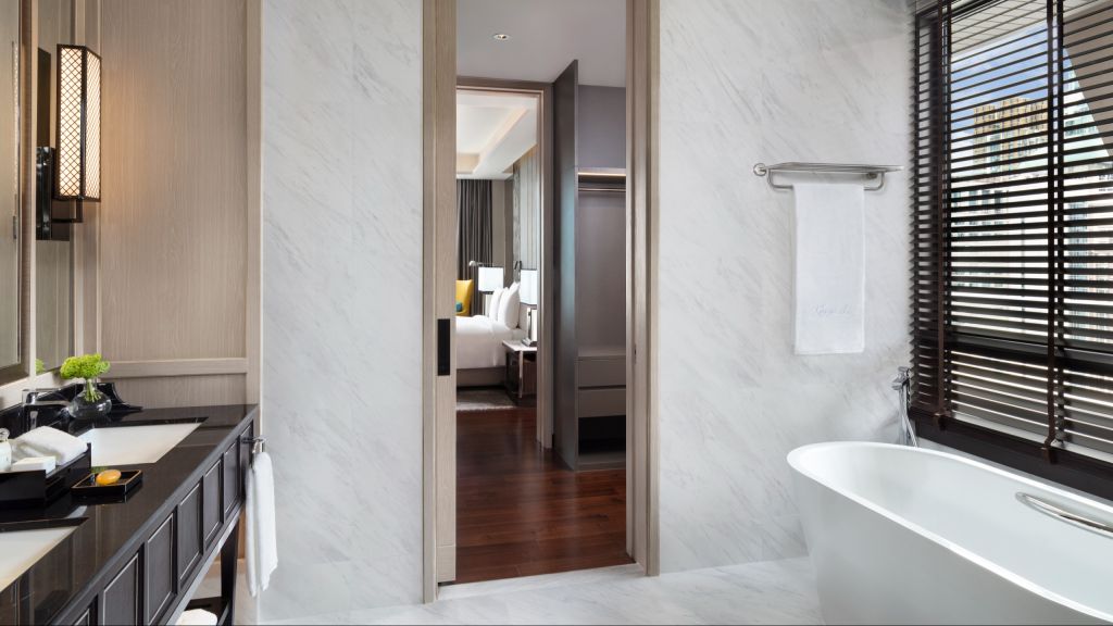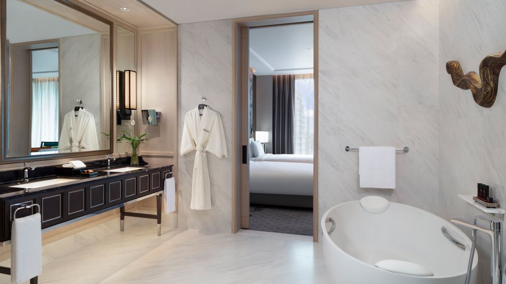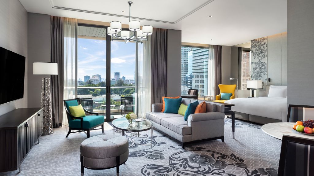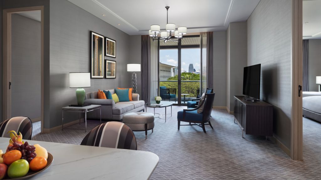 Grand executive suite - 1 king bed and option of 2 twin beds or king bed. Offering a unique option especially for family getaways with a master bedroom and kids room. Suite spanning up to 187 sqm where traditional thai blends with modern amenities to create an ambiance that makes every moment exquisite and memorable. The luxurious bed offers a restful sleep with a choice of pillows to suit your preference. Enjoy exclusive access to bangkok's rooftop club lounge offering complimentary breakfast, all day refreshments, afternoon tea and evening cocktails along. Also included is a complimentary mini bar offering locally curated juices and healthy snacks. Contemporary comforts such as a 65 inch tv and modern audio systems offers quality entertainment perfect for a downtime. Luxurious bathroom with walk-in shower and an oversized stand alone bathtub and decadent toiletries all combine to elevate the experience. Maximum occupancy: 4 (including infant or children and up to 3 adults), maximum 1 extra bed per bedroom