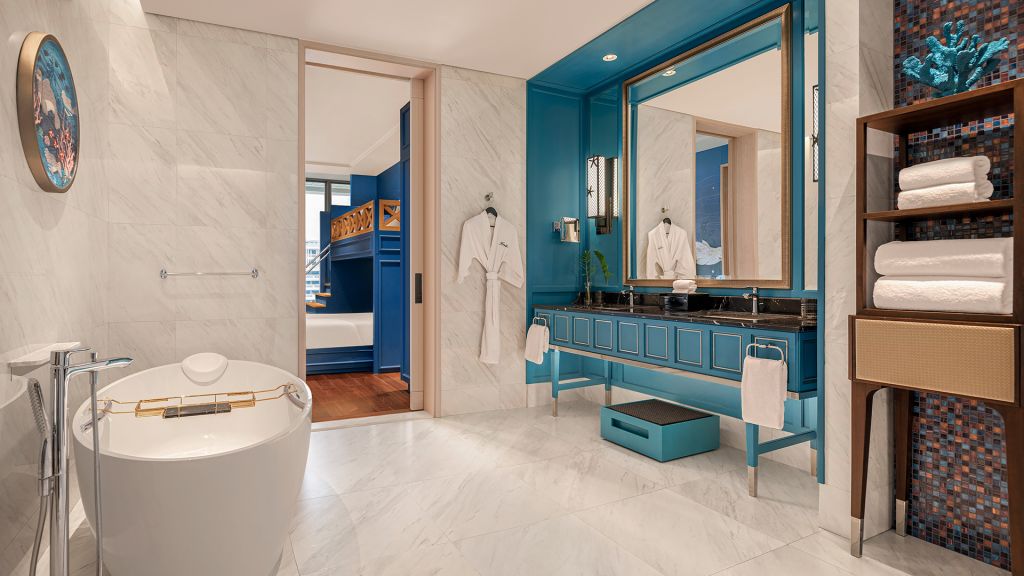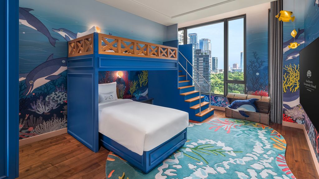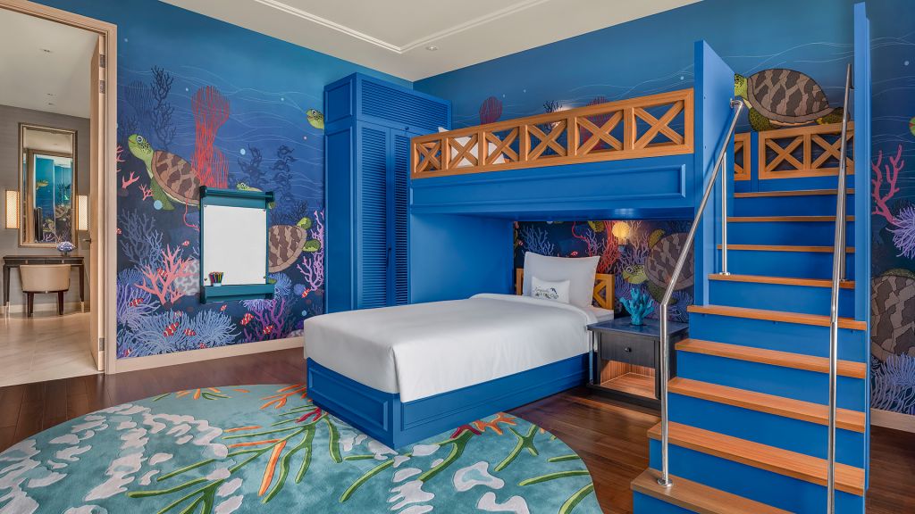 Sealife family suite - 1 king bed and 1 bunk bed. Family stays are more fun and comfortable in our undersea-inspired suites. Located on floor 10 alongside the kempinski kids’ club, each suite is hosted by loma, tuli or silo and features undersea-themed play spaces, including a treasure chest of toys and games. In-room amenities such as slippers and dental care sets just for little ones await in the children’s bathroom, and bunk beds are ideal for a peaceful slumber. Maximum occupancy: 2 adults and 2 children, or 1 adult and 3 children under 12 years old.