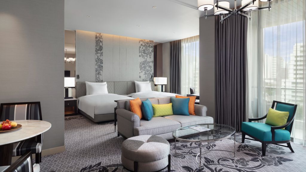 2 bedroom grand executive suite - 1 king bed and 2 twin beds. Ambient daylight, opulence with comforts of a home spanning up to 145 sqm with a spacious balcony our grand executive suite is ideal for family getaways. The luxurious bed offers a restful sleep with a choice of pillows to suit your preference. Enjoy exclusive access to bangkok's rooftop club lounge offering complimentary breakfast, all day refreshments, afternoon tea and evening cocktails along. Also included is a complimentary mini bar offering locally curated juices and healthy snacks. Contemporary comforts such as a 65 inch tv and modern audio systems offers quality entertainment perfect for a downtime. Luxurious bathrooms with walk-in shower and an oversized stand alone bathtub and decadent toiletries all combine to elevate the experience. Maximum occupancy: 8 (including infant or children and up to 4 adults), maximum 1 extra bed per bedroom