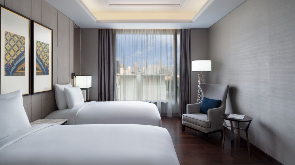 Executive club twin room - 2 twin bed. These well appointed rooms are luxurious in style featuring contemporary thai elegance. The oversized executive club room spanning up to 90 sqm is ideal for two persons including a spacious balcony overlooking bangkok's city skyline and the surrounding gardens. These rooms are ideal to unwind after a day out exploring the city. Enjoy exclusive access to the club lounge with additional benefits offering complimentary breakfast, all day refreshments, afternoon tea and evening cocktails while living the good life. Complimentary healthy minibar is included along with contemporary comforts such as a 65 inch smart tv, modern audio systems, and more. Maximum occupancy: 4 (including infant or children and up to 3 adults), maximum 1 extra bed per bedroom