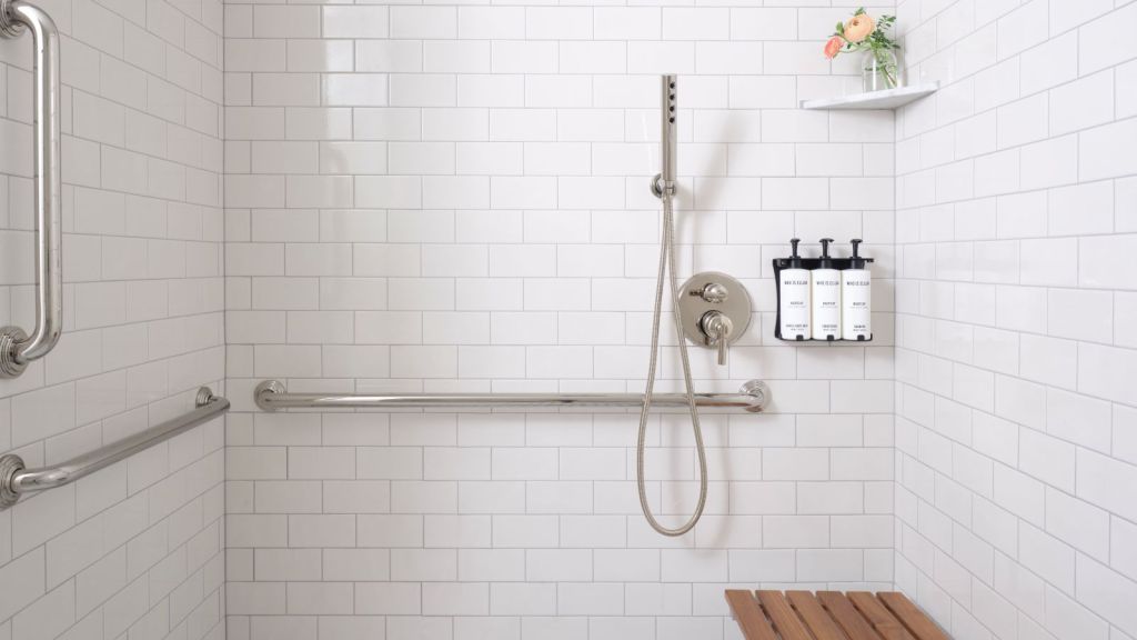 Measuring 465–535 square feet of space, this accessible room offers a plush king bed with 40” bedside clearance, a stylized dining table with lounge seating, a vintage-inspired minibar, a walk-in closet, and an accessible bathroom featuring a tub with grab bars.