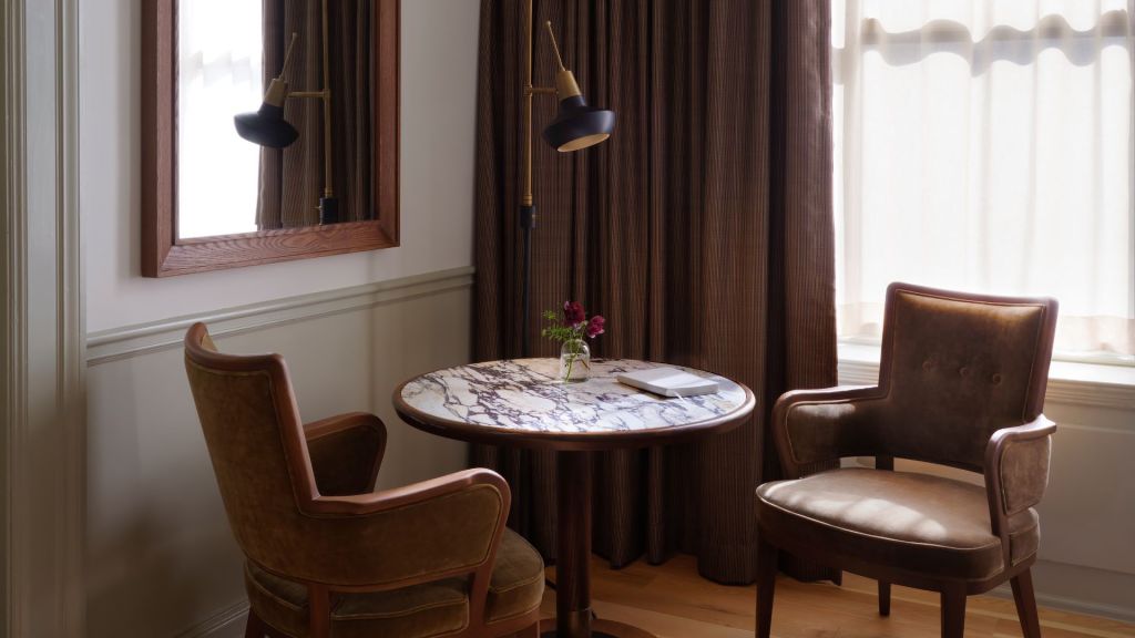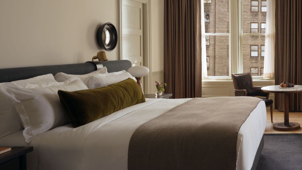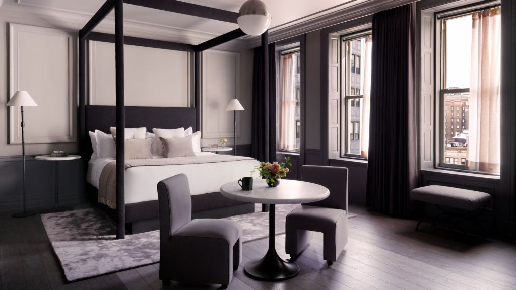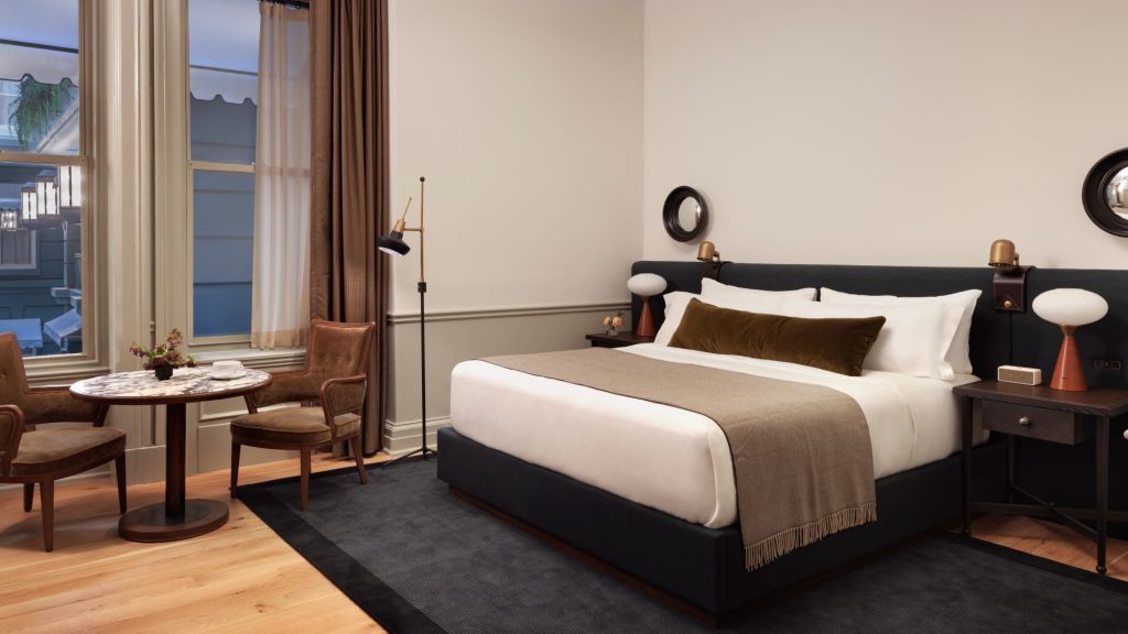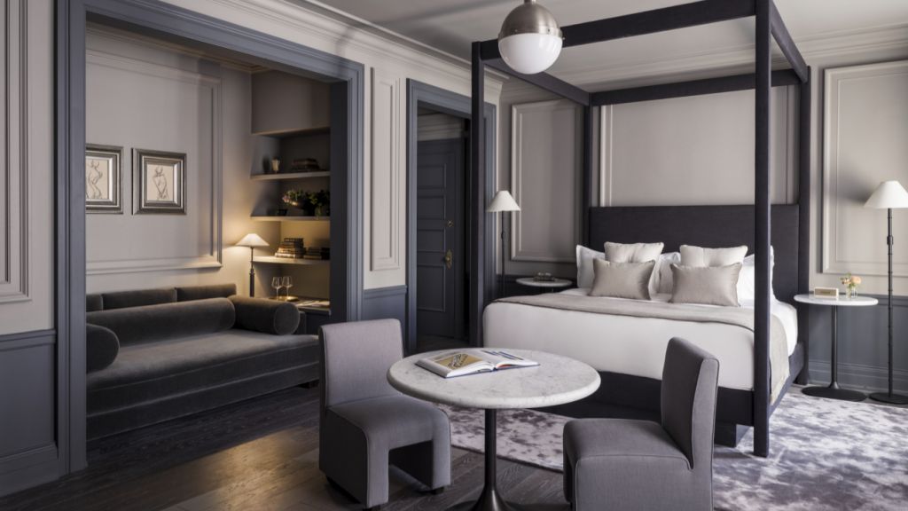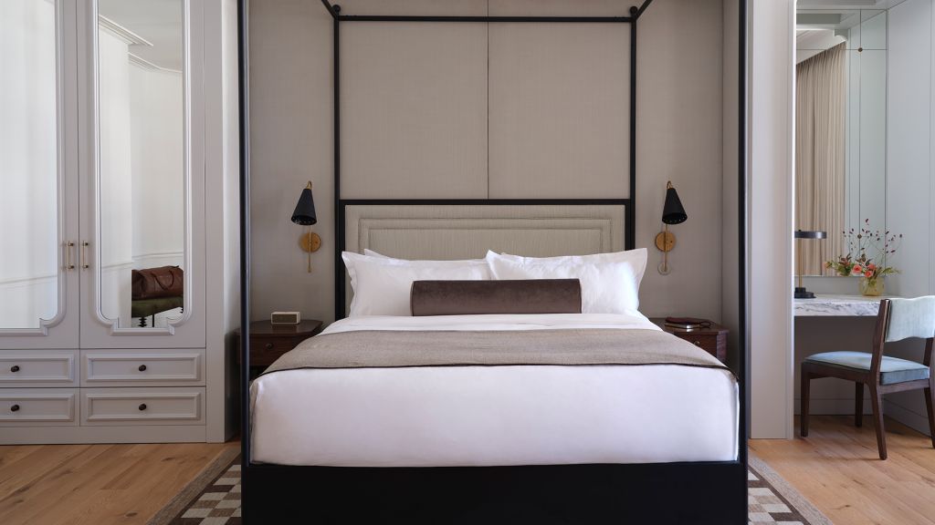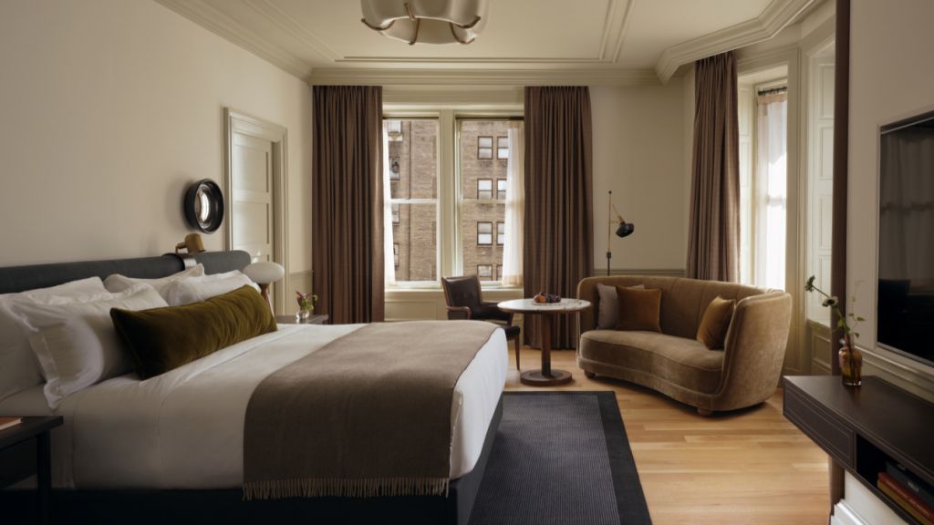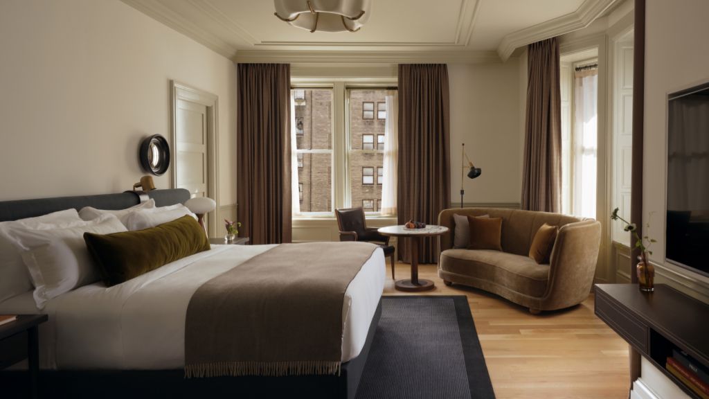 Delight in the details of this deluxe room offering a plush king bed, a stylized dining table with lounge seating, a vintage-inspired minibar, a walk-in closet, a modern bathroom with a walk-in shower, and 465–535 square feet of space.