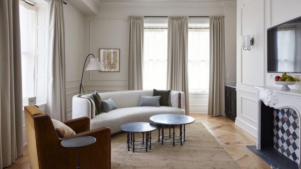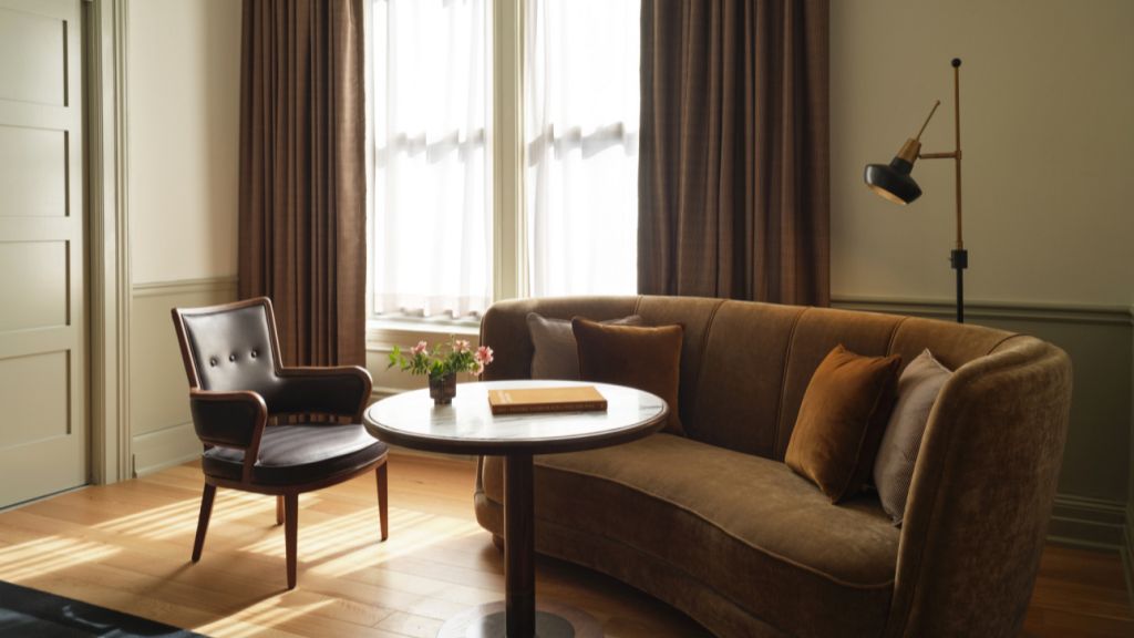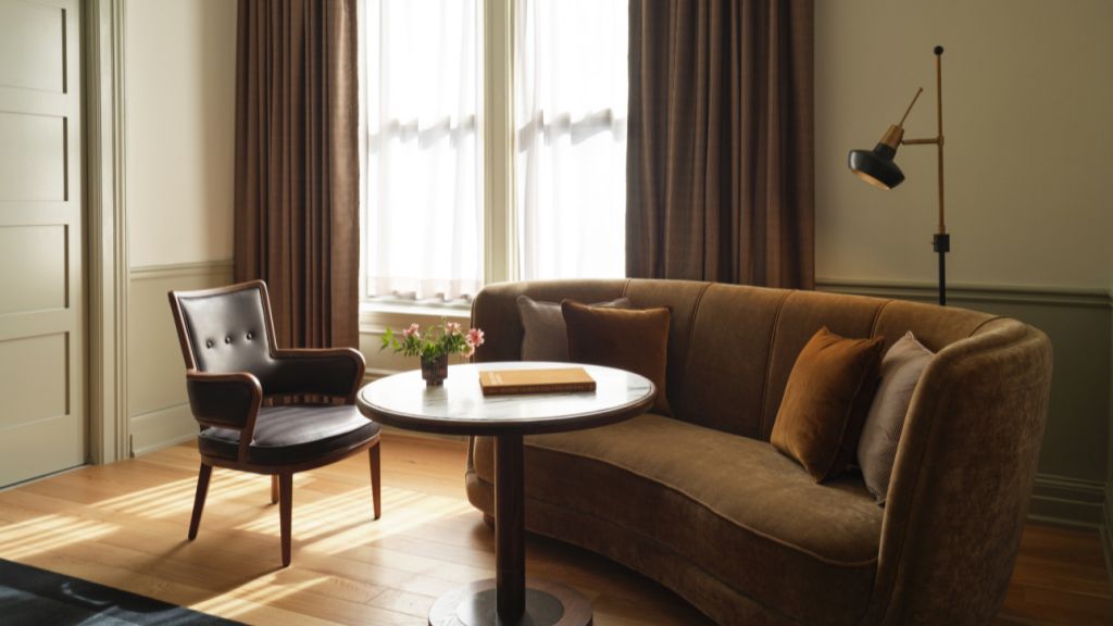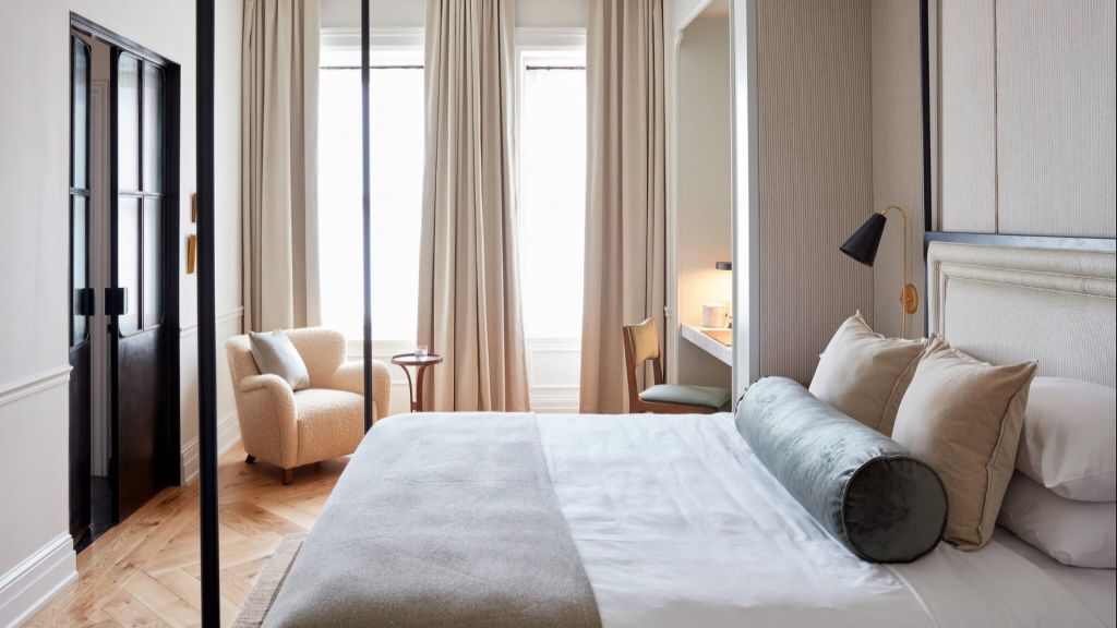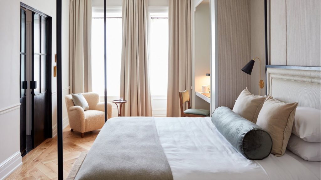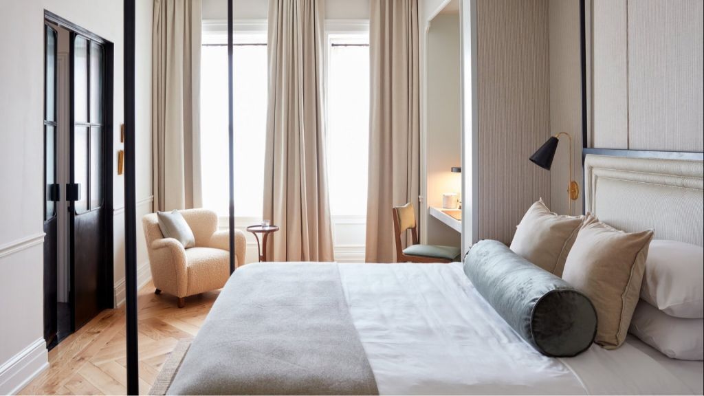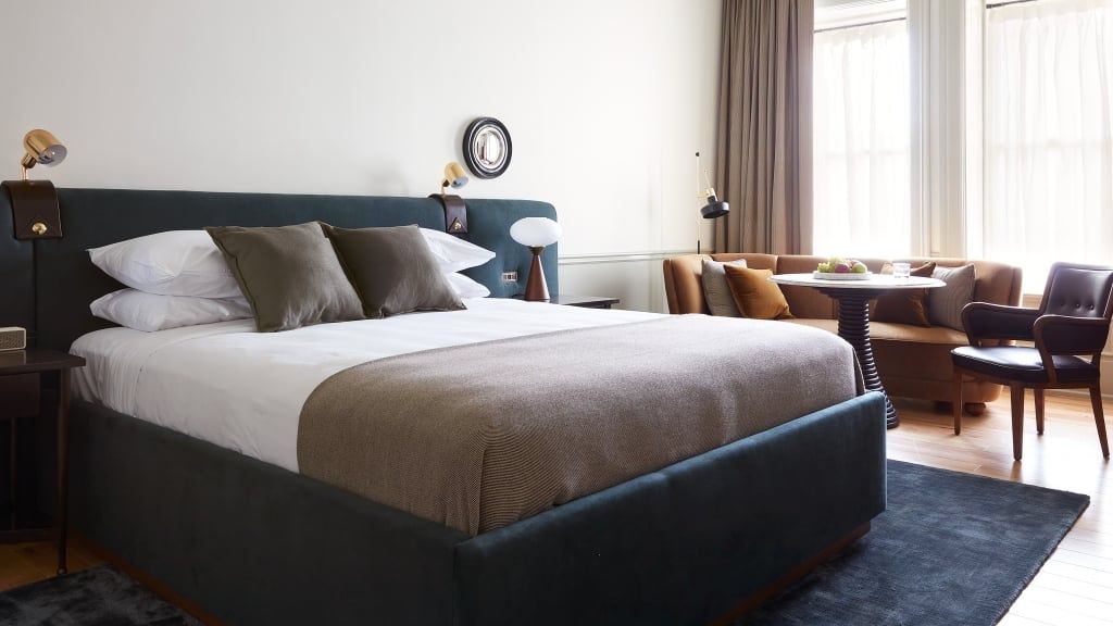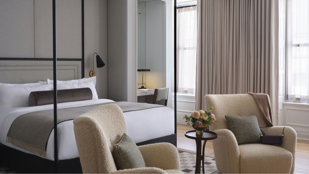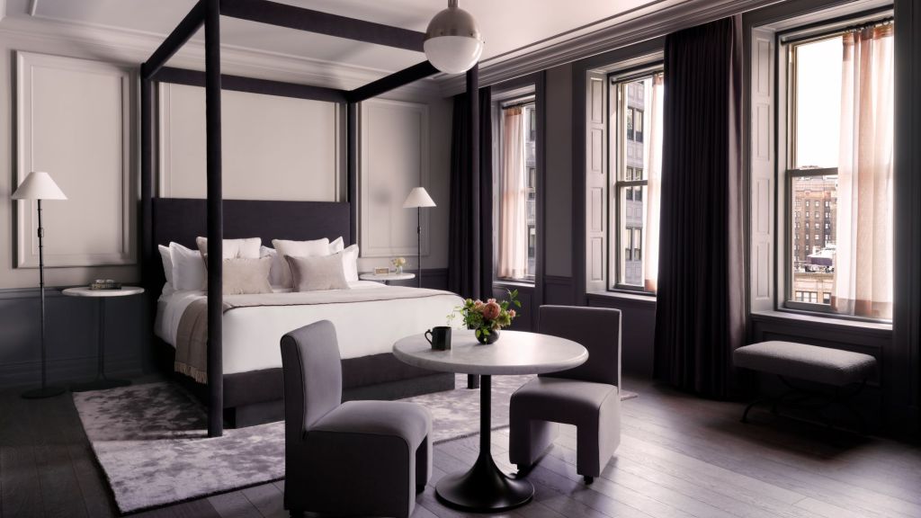 Delight in the details of this deluxe room offering a plush king bed, a stylized dining table with lounge seating, a vintage-inspired minibar, a walk-in closet, a modern bathroom with a walk-in shower, and 465–535 square feet of space.