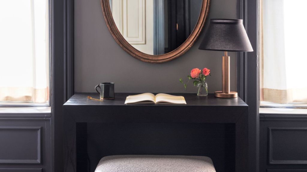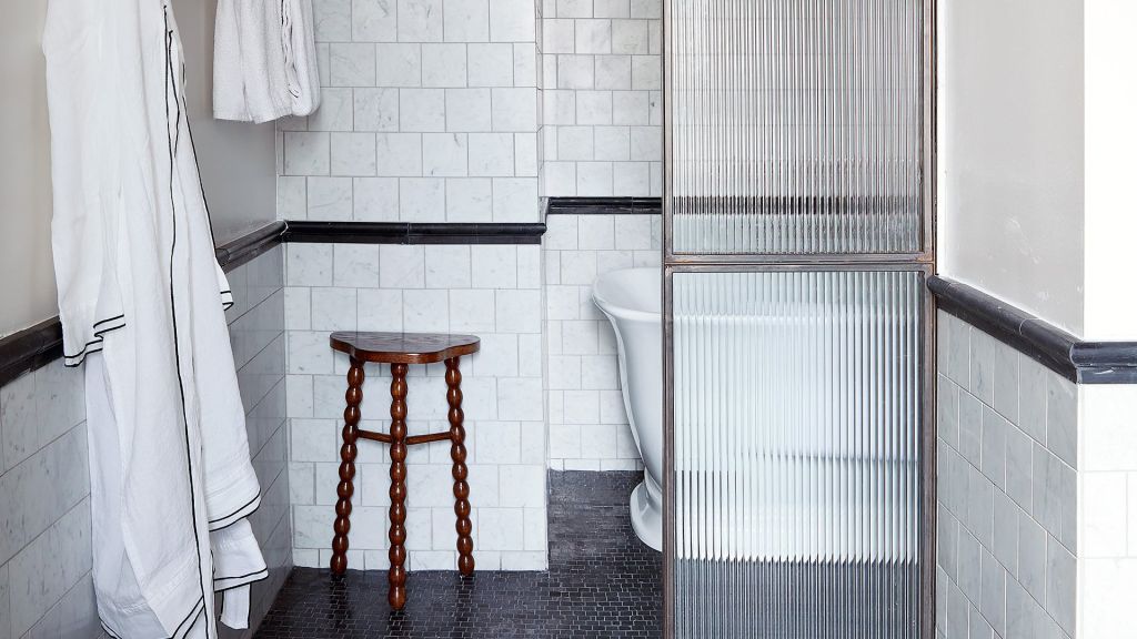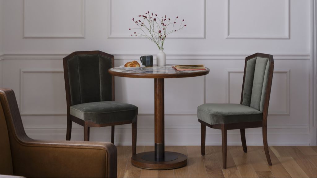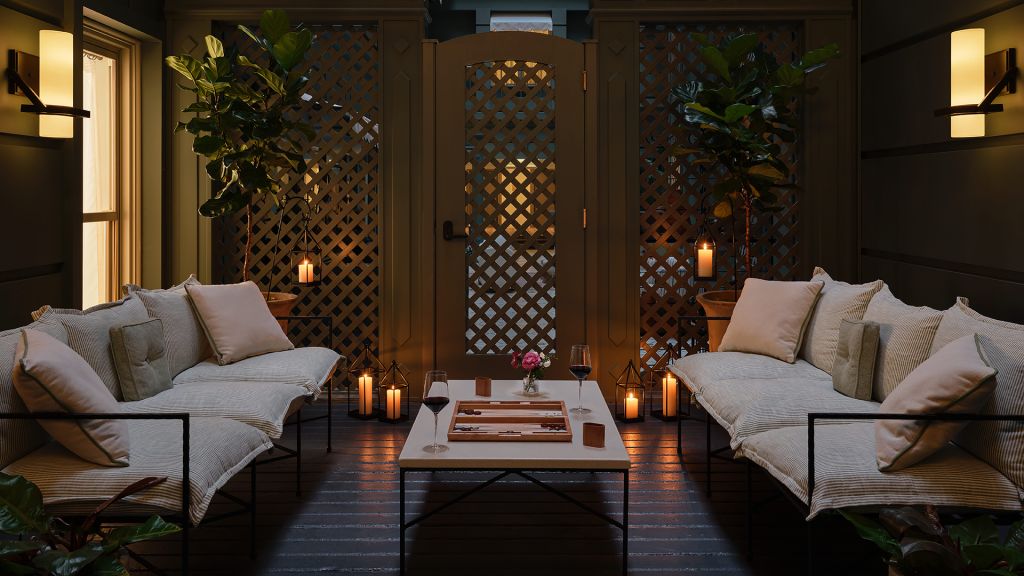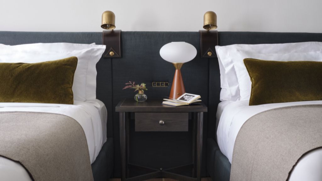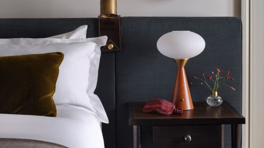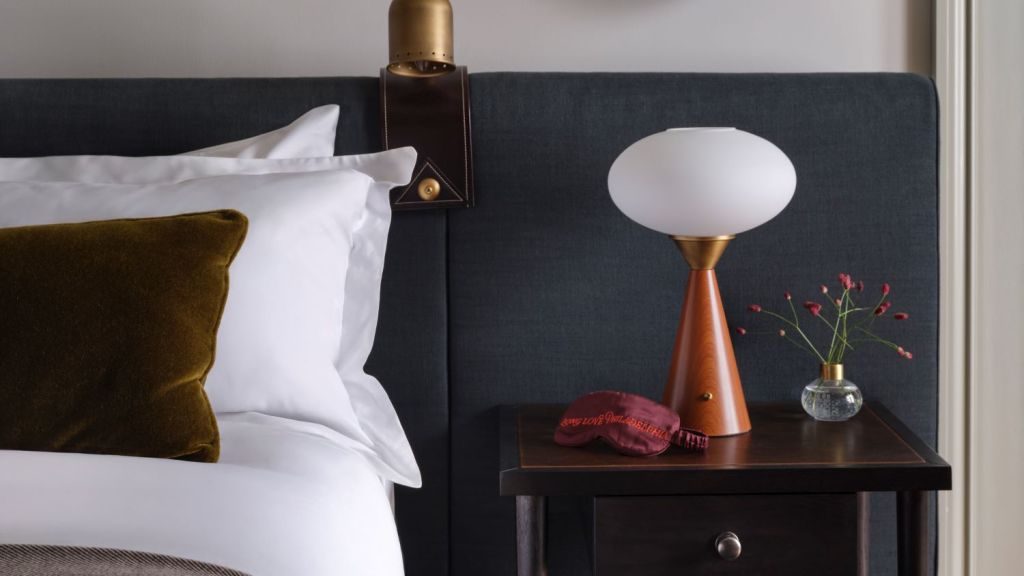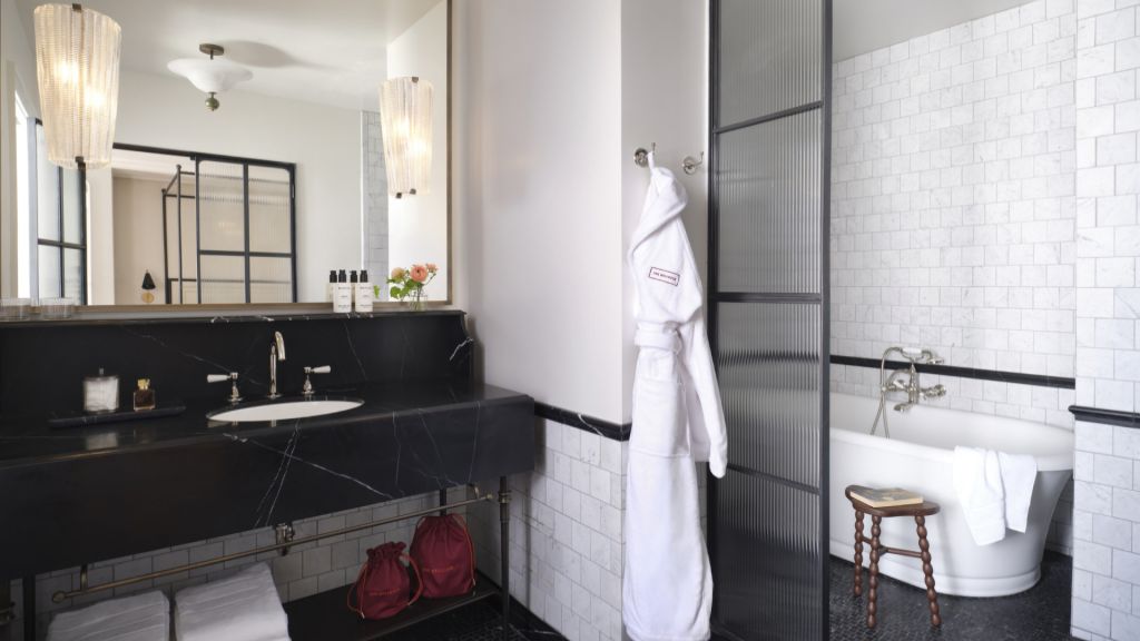 Delight in the details of this deluxe room offering a plush king bed, a stylized dining table with lounge seating, a vintage-inspired minibar, a walk-in closet, a modern bathroom with a walk-in shower, and 465–535 square feet of space.