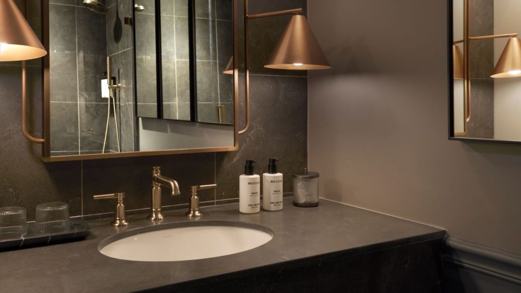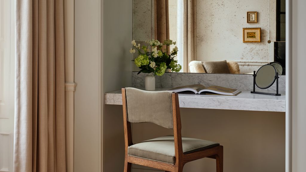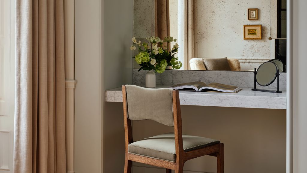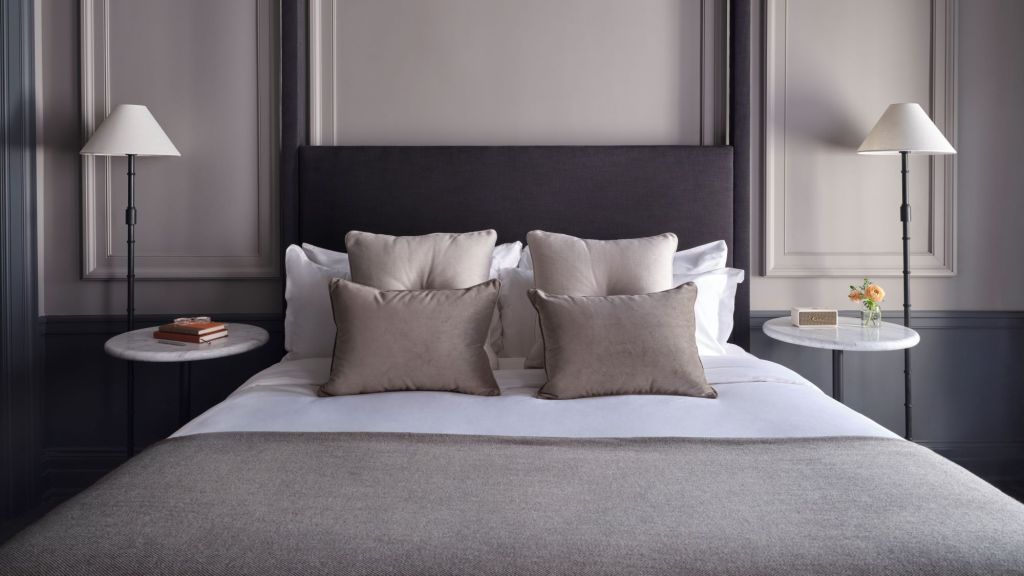 This well-appointed suite offers a timeless style. Enjoy a plush king bed, a custom library nook, a writing desk, a stylized dining area, a walk-in closet, and a modern bathroom with a walk-in shower in an interior measuring 556–686 square feet.