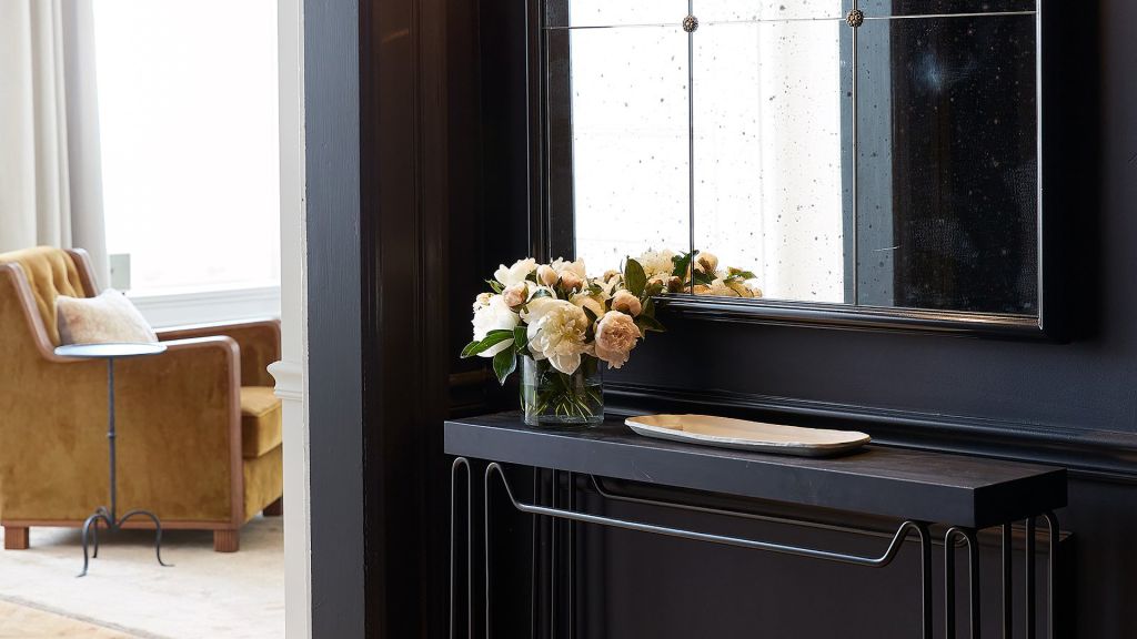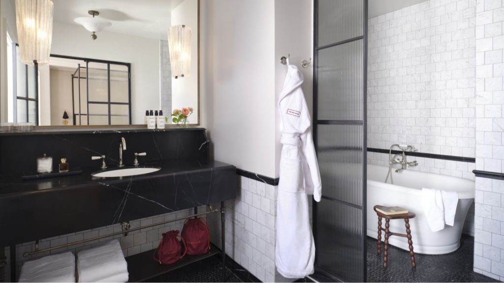 Rich in natural light, this corner suite offers expansive city views, a private foyer, a living area with a dining table, and a bedroom with one king bed. This suite also features a writing desk, a walk-in closet, a modern bathroom with a handheld showerhead, and 762–1,117 square feet of space.