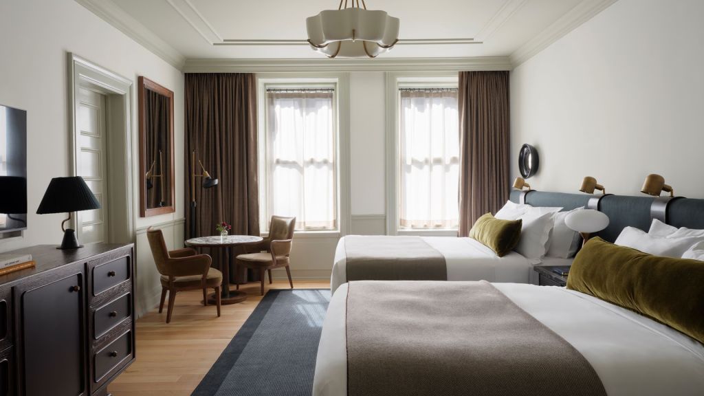 Stay with ample comfort in Two Queen Beds, which offers two luxe queen beds, stylized dining area, walk-in closet and modern bath with walk-in shower. Room sizes average 425 square feet.