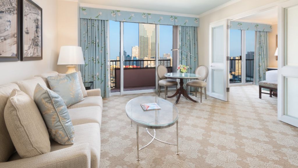 French doors separating living room, two 42-inch hd smart tvs, complimentary wi-fi, private balcony, cubietime bluetooth alarm clock with usb charging ports, fully stocked mini-bar, deluxe sofa sleeper, mini refrigerator, designer bath amenities by diptyque, italian marble over-sized bathroom, signature windsor court plush bath robes and slippers, in-room safe, twice daily housekeeping service, 100% non-smoking hotel